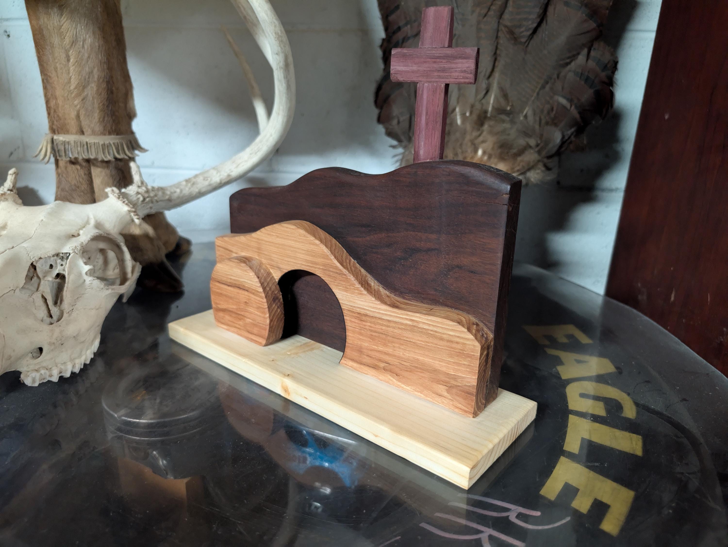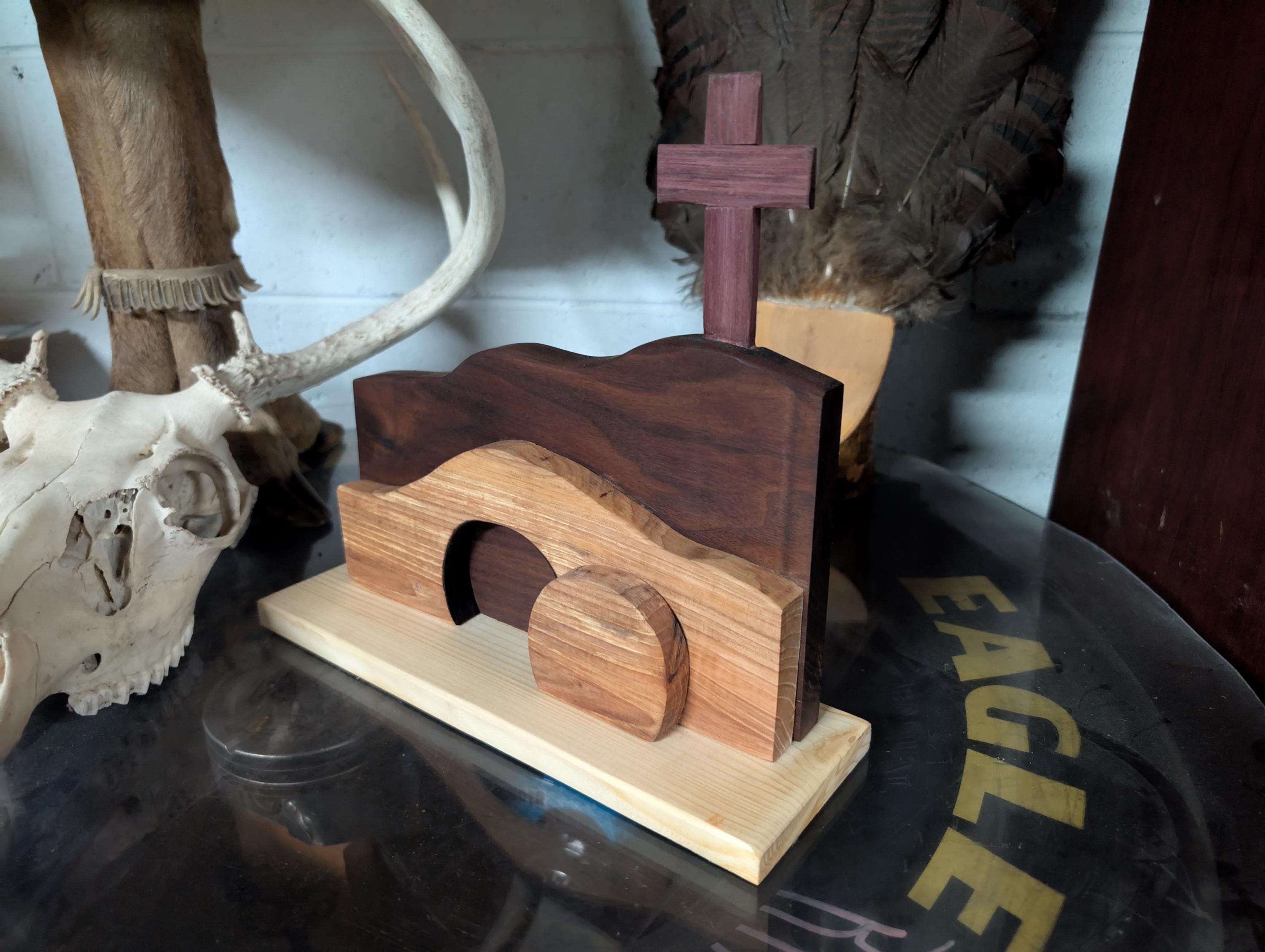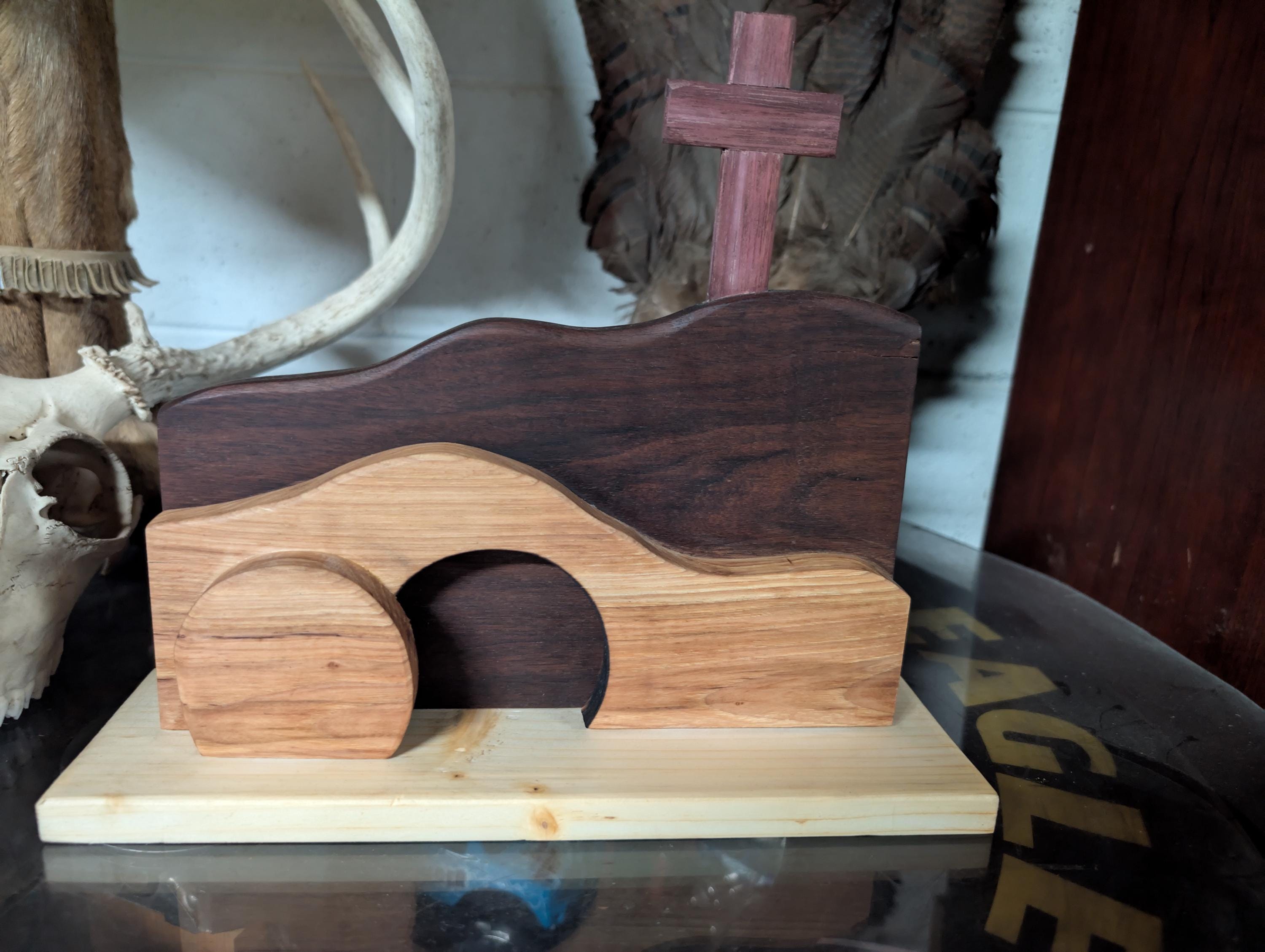 This hand-crafted wooden Easter Resurrection Tomb Scene is a medium-sized terrain/scenery piece perfect for celebrating the Easter occasion. Made from natural Walnut, and oak wood with a pine wood base and a cross made of purple heart with a natural finish, it features a religious theme depicting the resurrection of Jesus Christ. Crafted in the United States, this beautiful decoration is sure to add a touch of spirituality to your home or office during the holiday season. The EMPTY TOMB- the true reason for the Easter season.