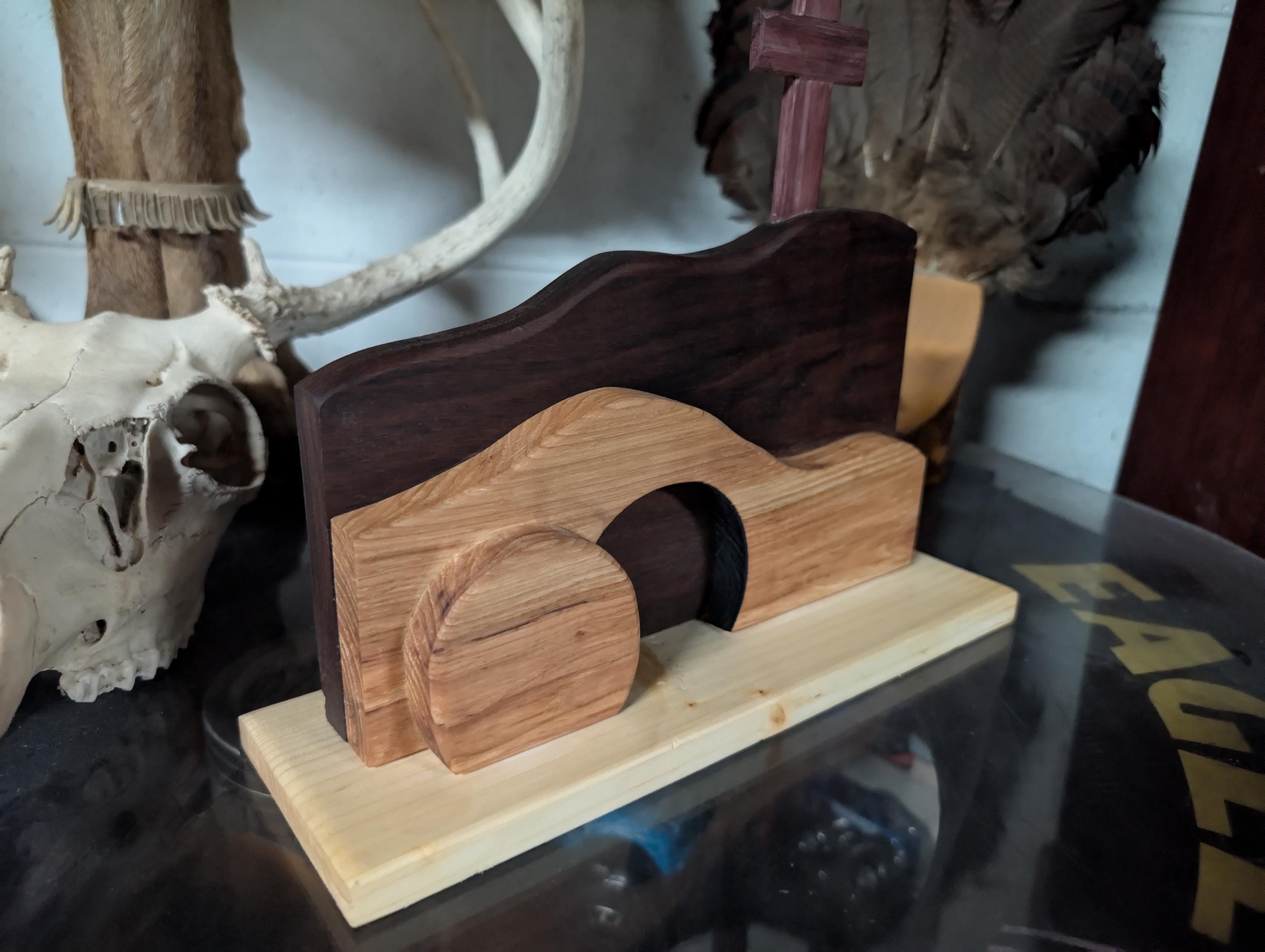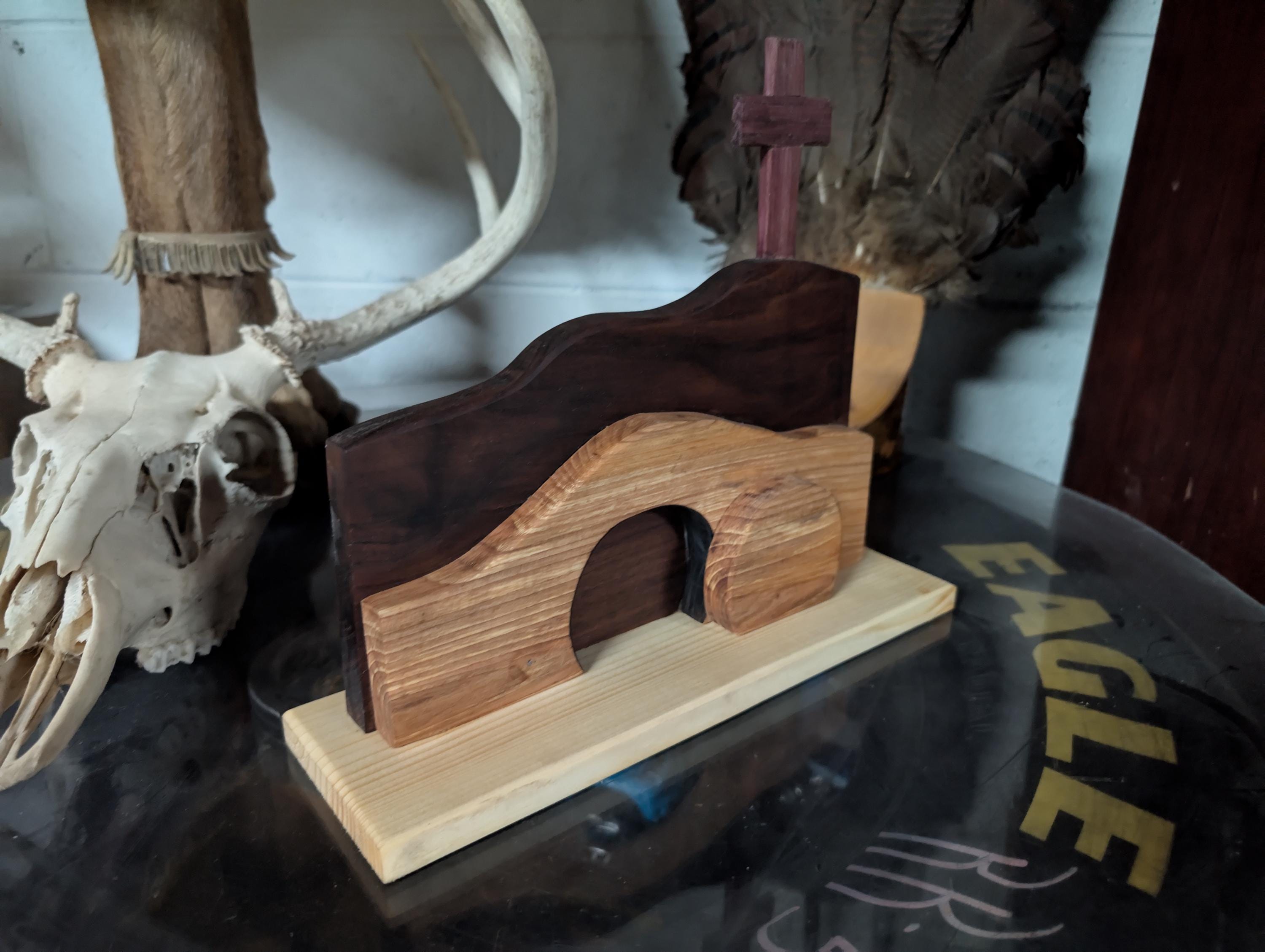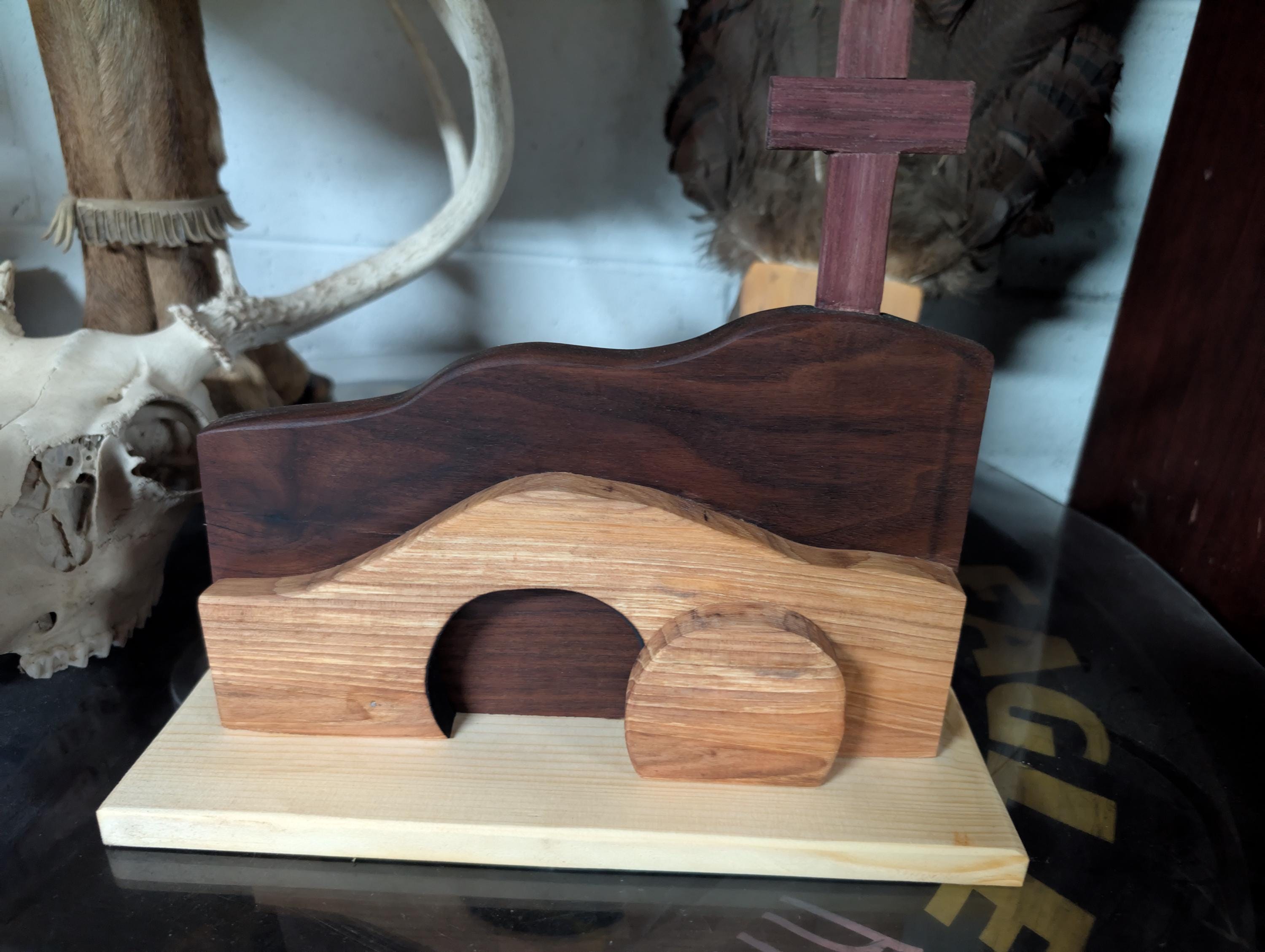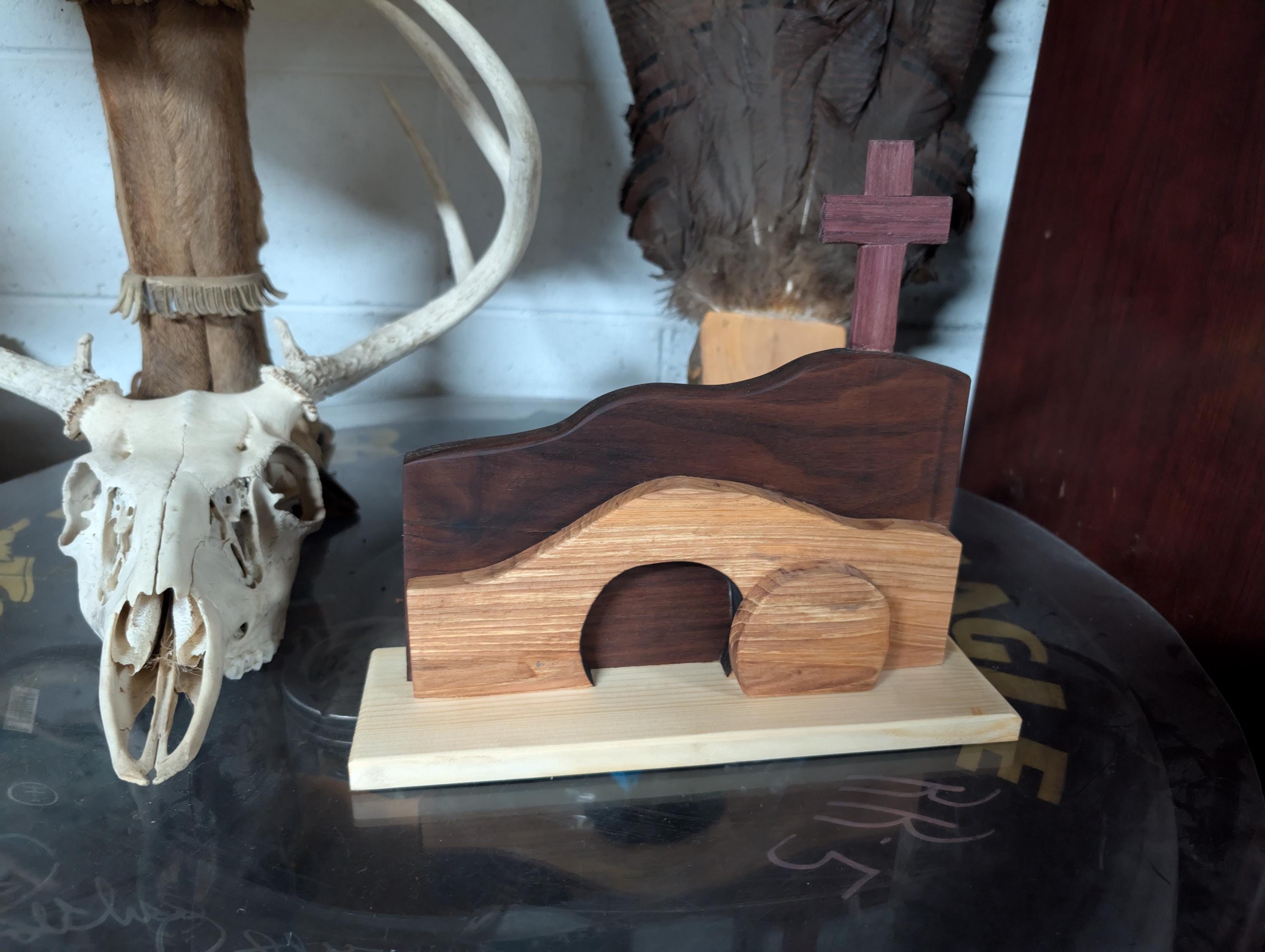 This hand-crafted wooden Easter Resurrection Tomb Scene is a medium-sized terrain/scenery piece perfect for celebrating the Easter occasion. Made from natural Walnut, and oak wood with a pine wood base and a cross made of purple heart with a natural finish, it features a religious theme depicting the resurrection of Jesus Christ. Crafted in the United States, this beautiful decoration is sure to add a touch of spirituality to your home or office during the holiday season. The EMPTY TOMB- the true reason for the Easter season.