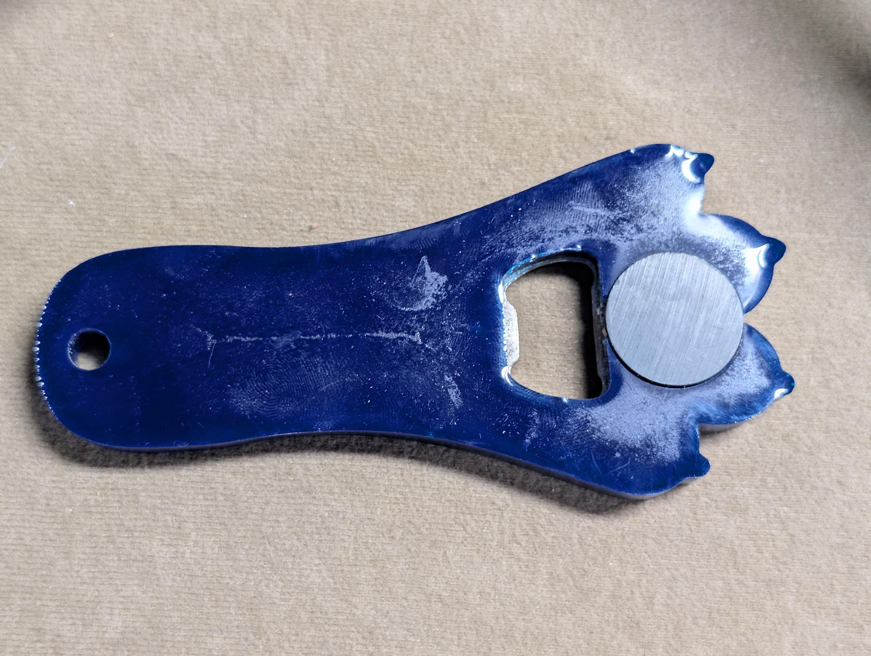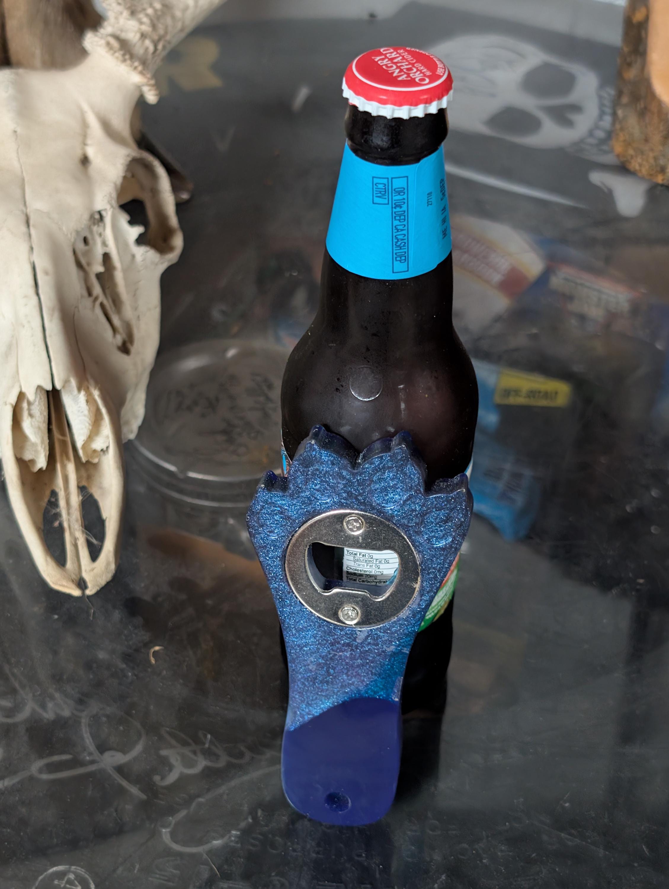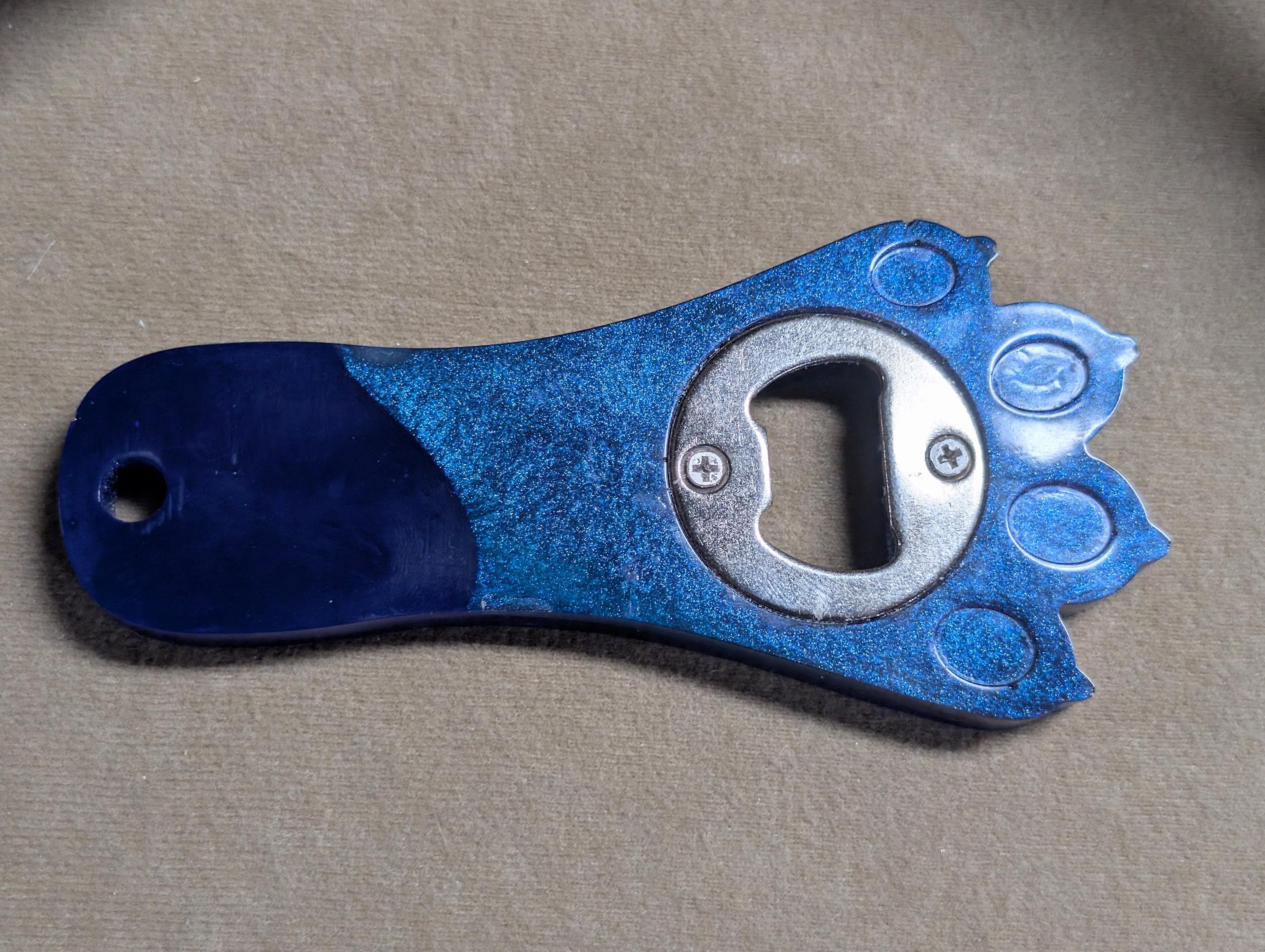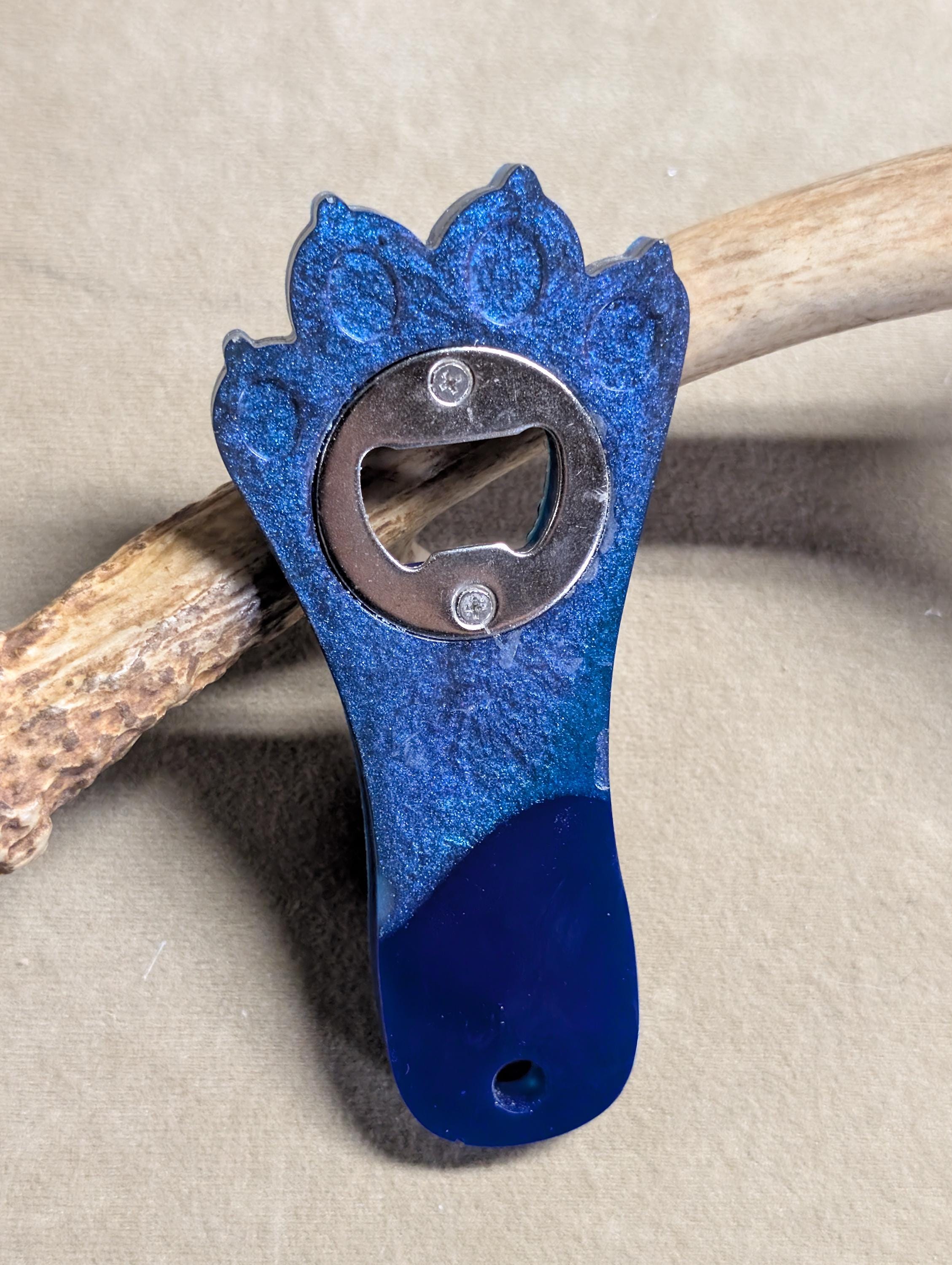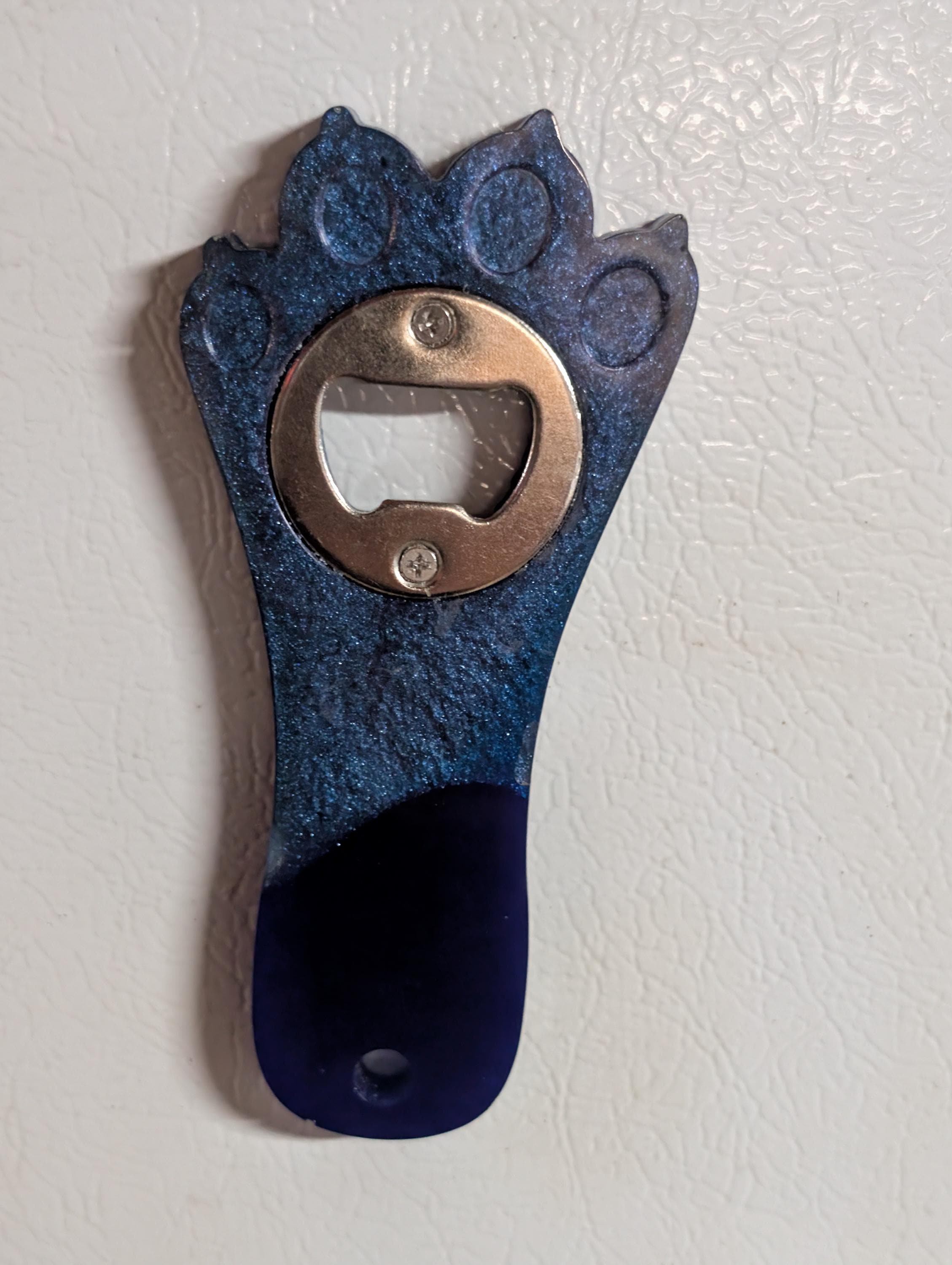 This Made in USA paw print resin bottle opener with magnet is a unique addition to any collection. Hand crafted with care, this opener features a Dark blue and Blue/purple chameleon color scheme that adds a fun pop to your breweriana collection. Made in the United States, this paw print design adds a playful touch to your barware. The magnet on the back allows for convenient storage, making it both functional and stylish for any beer enthusiast. Other color options are available just let us know what you would like customizations may very price so please contact first.
