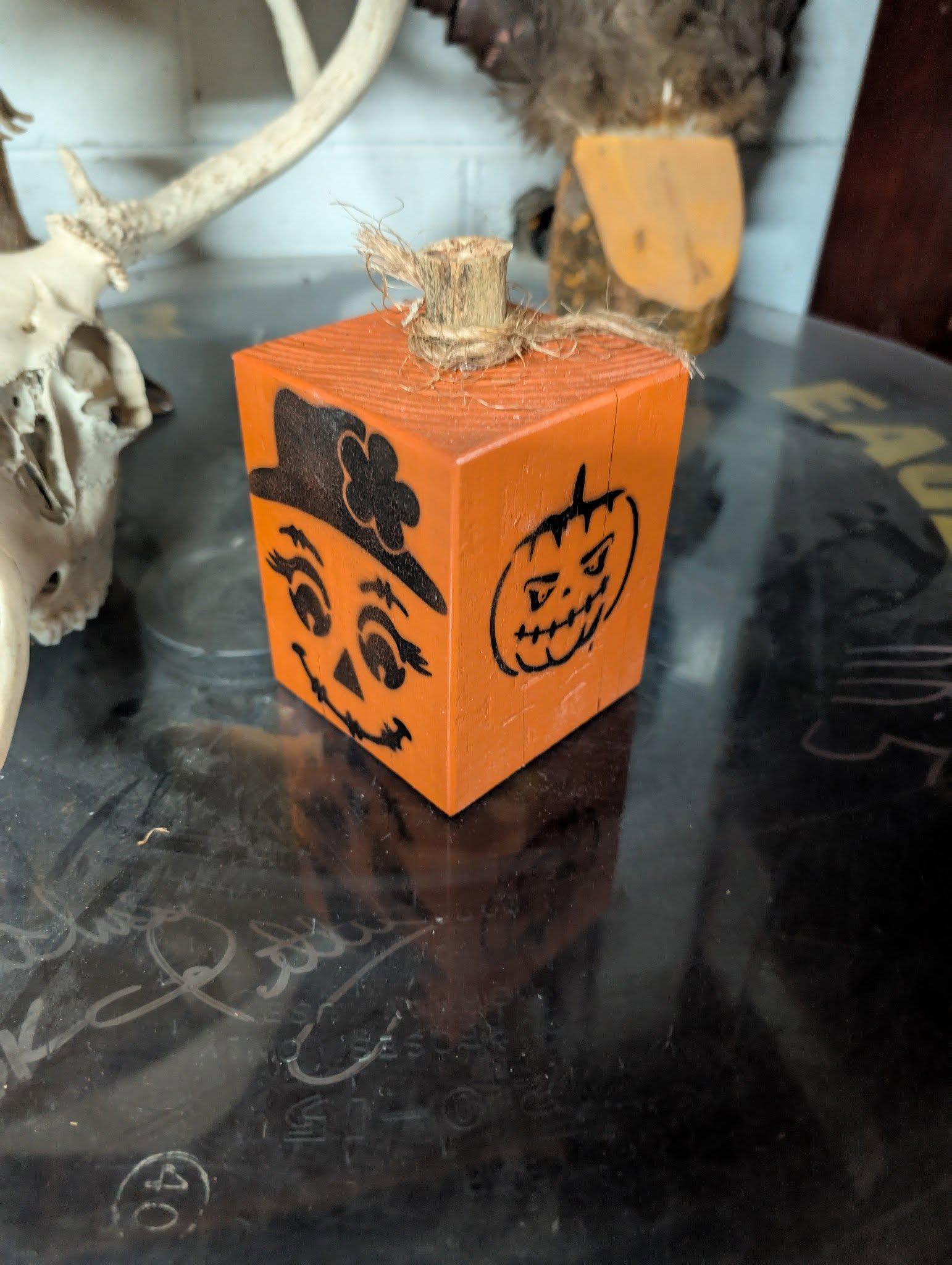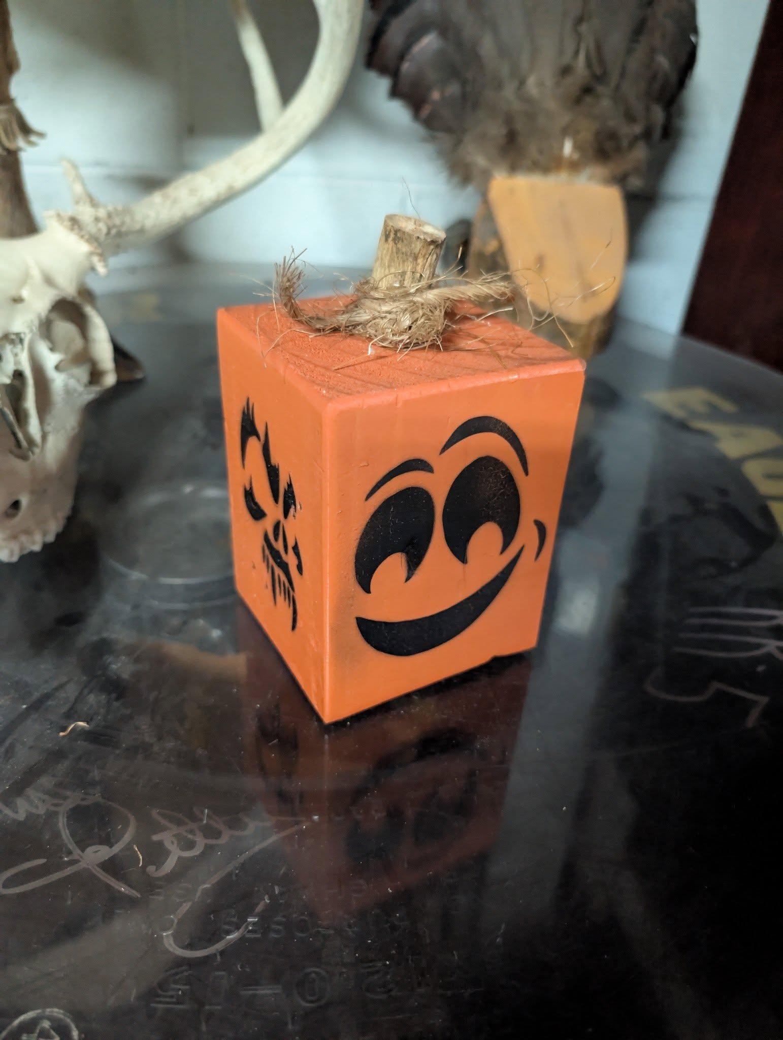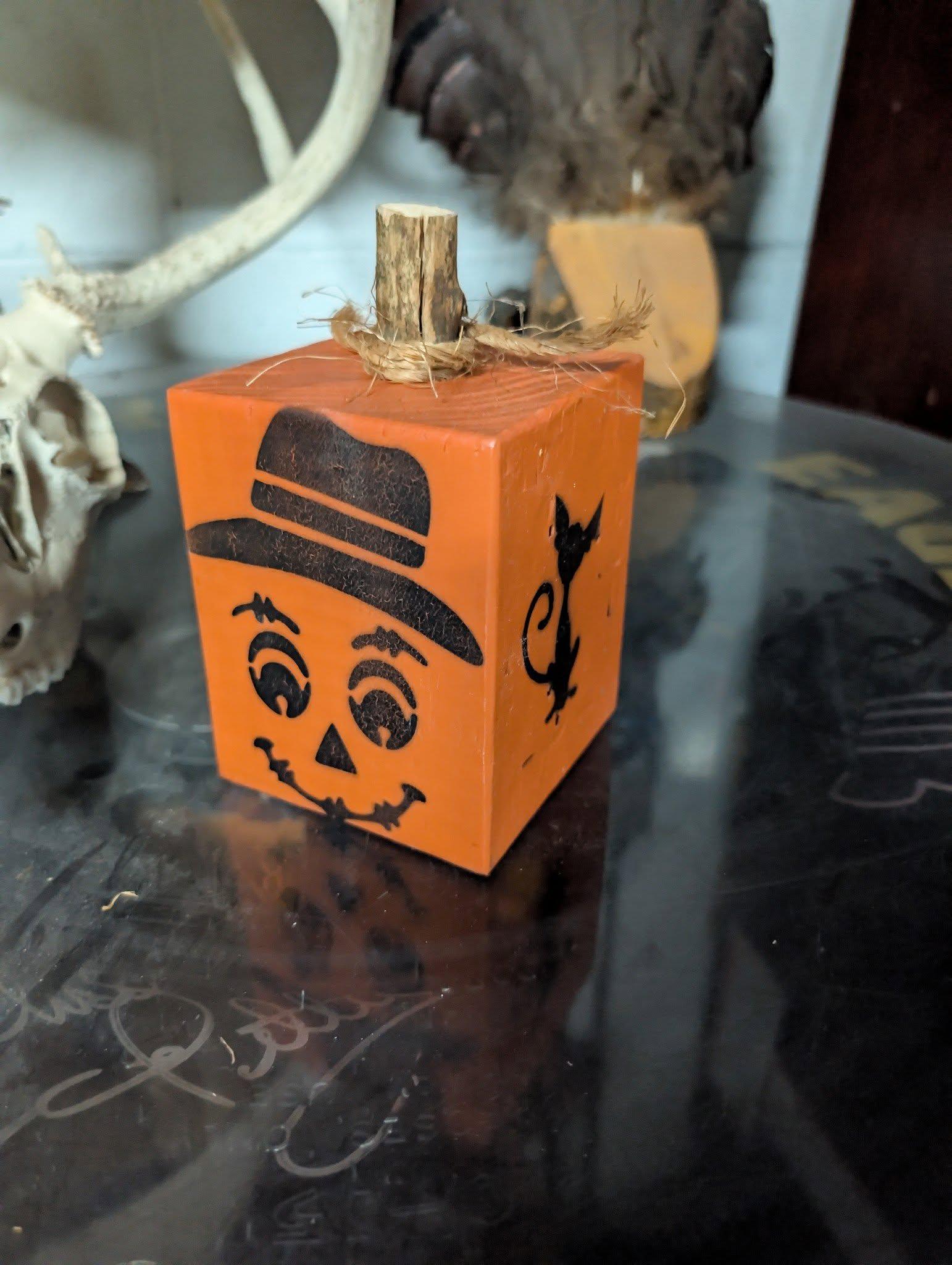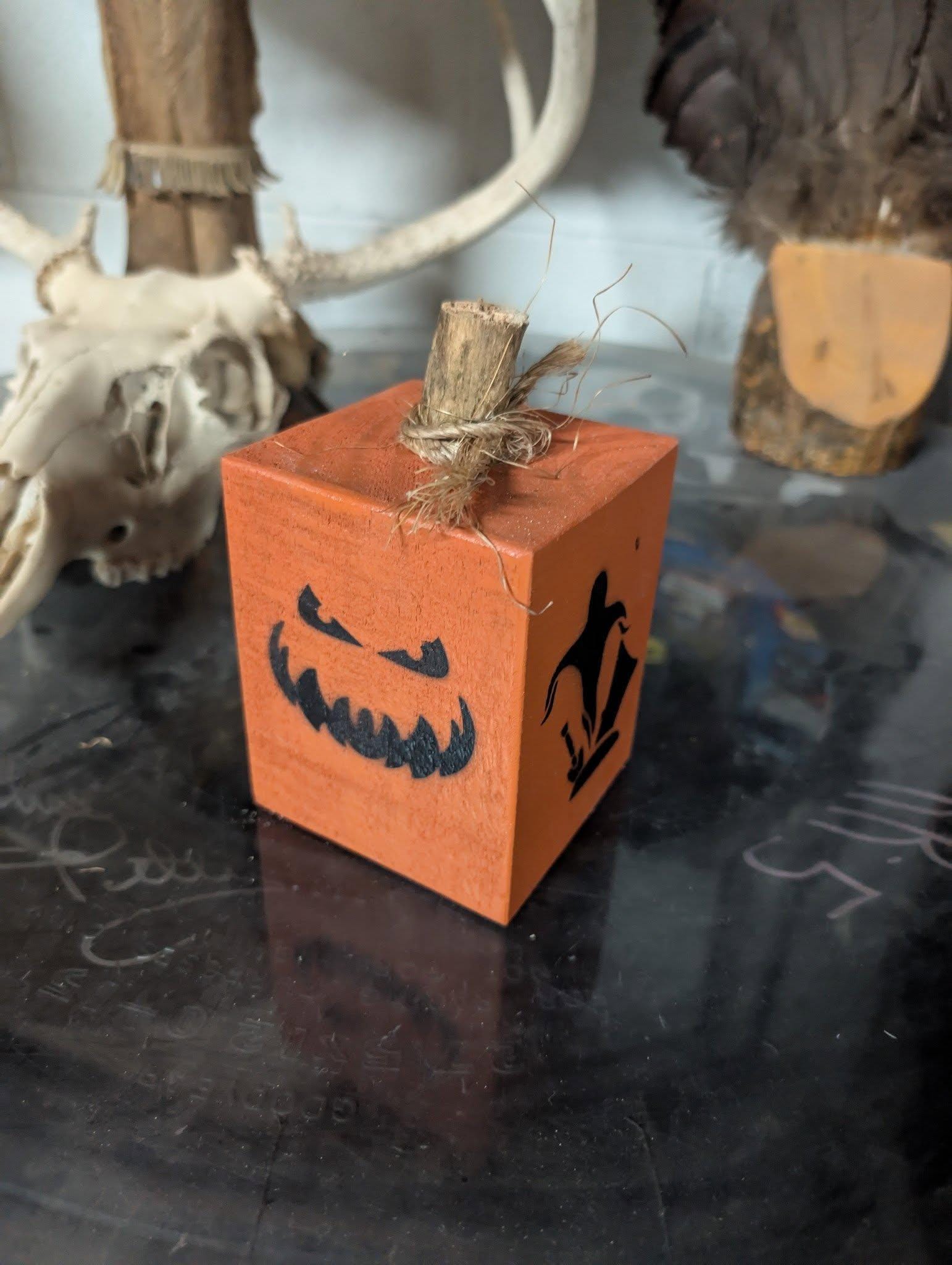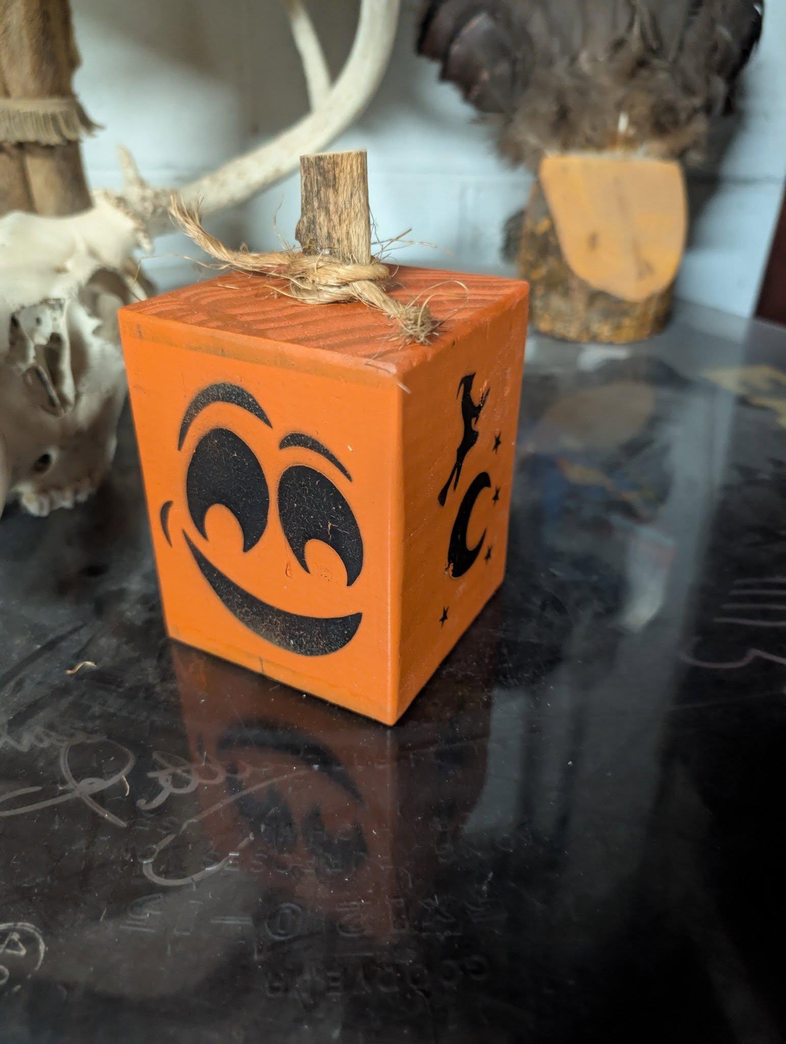 This Halloween decor item is a handmade wooden small pumpkin or jack-o-lantern, perfect for adding a seasonal touch to your home classroom or office. The orange color and about 4" squared and 5" in height make it a charming addition to any room or porch. With a free-standing mounting style and matte finish, with Halloween characters or faces on 4 sides. This unique piece hand crafted in the United States is a lightweight of approximately 1 lb, making it easy to display for the occasion. Price is for one pumpkin and includes shipping in the US.