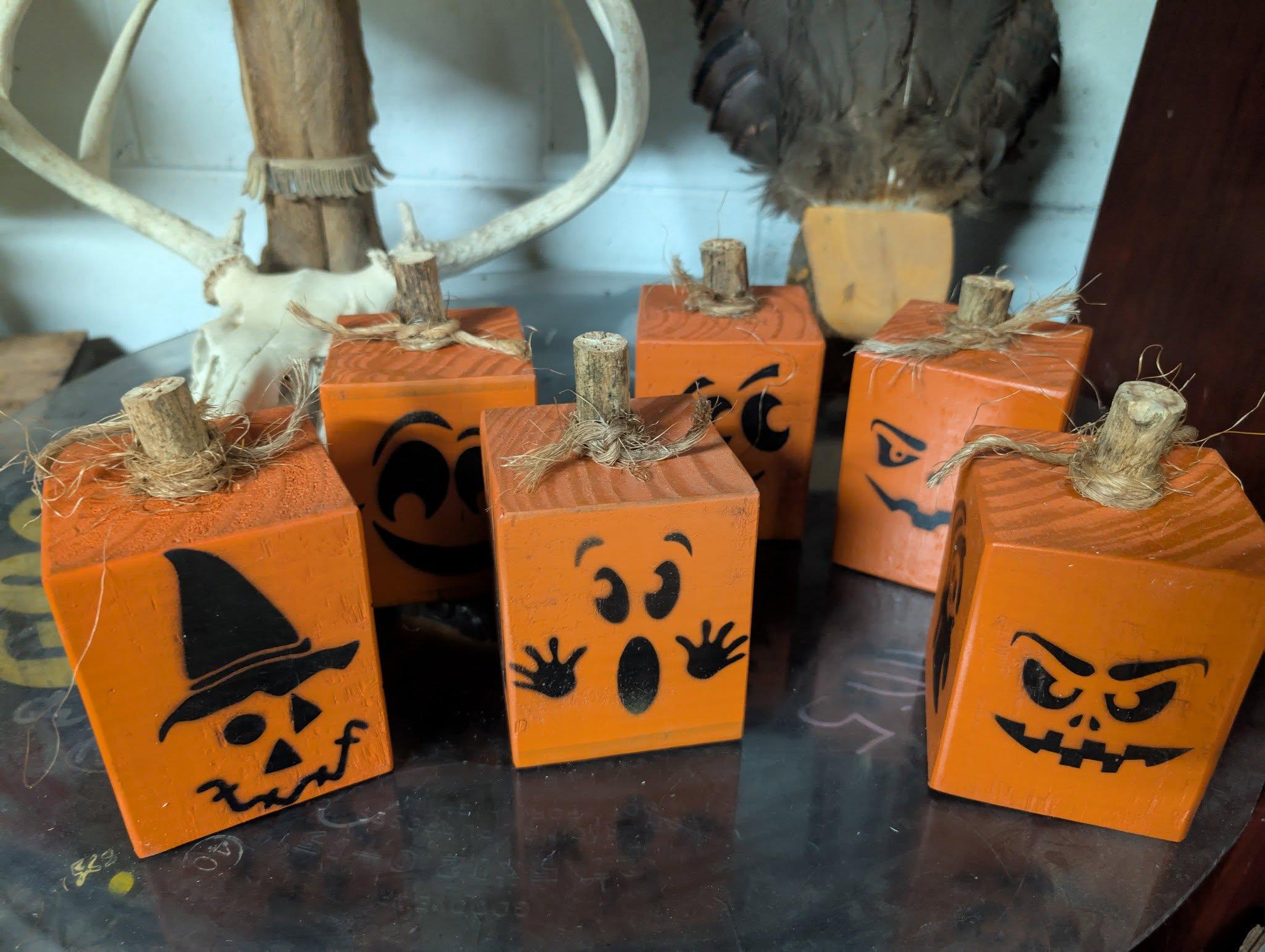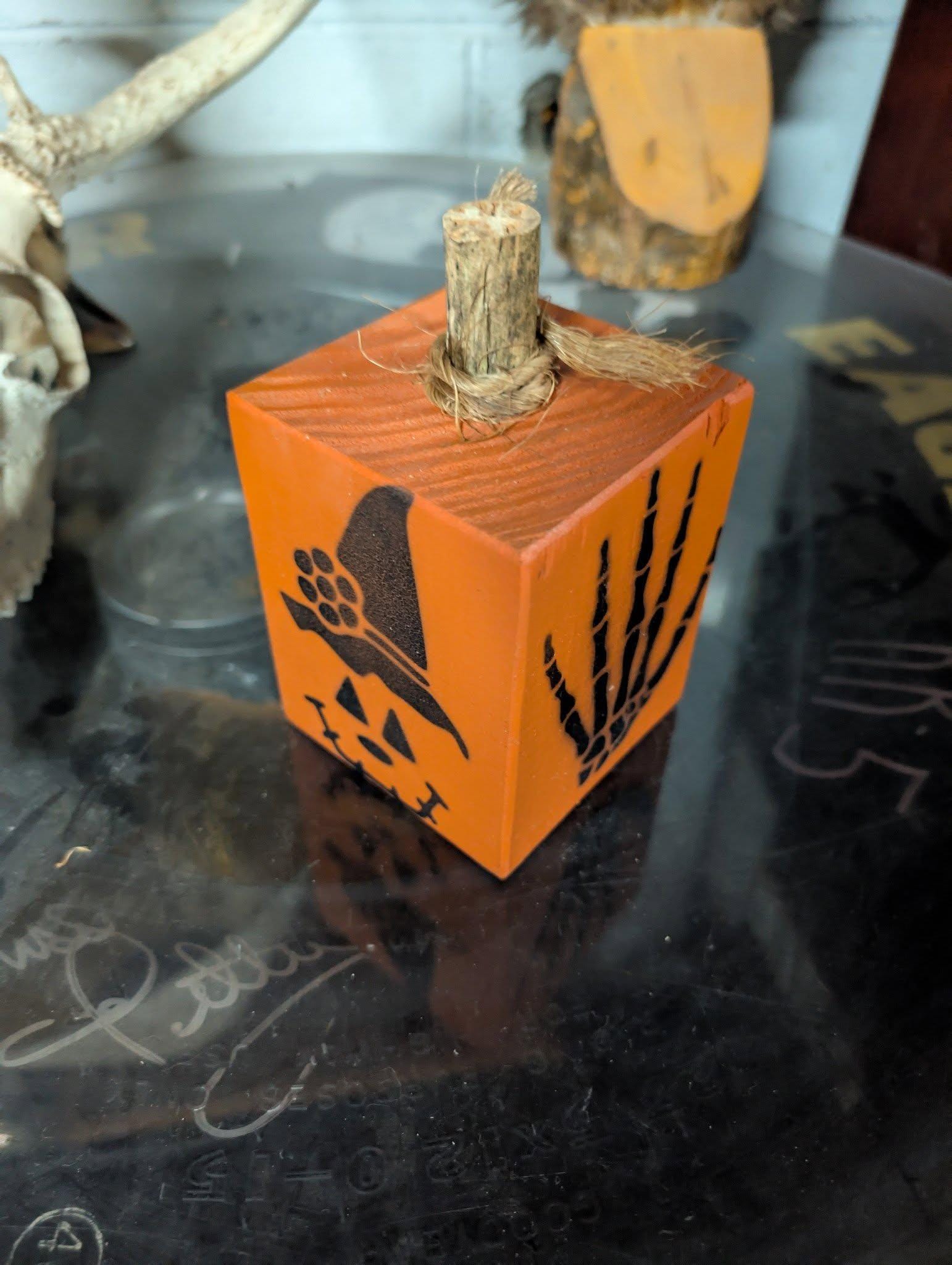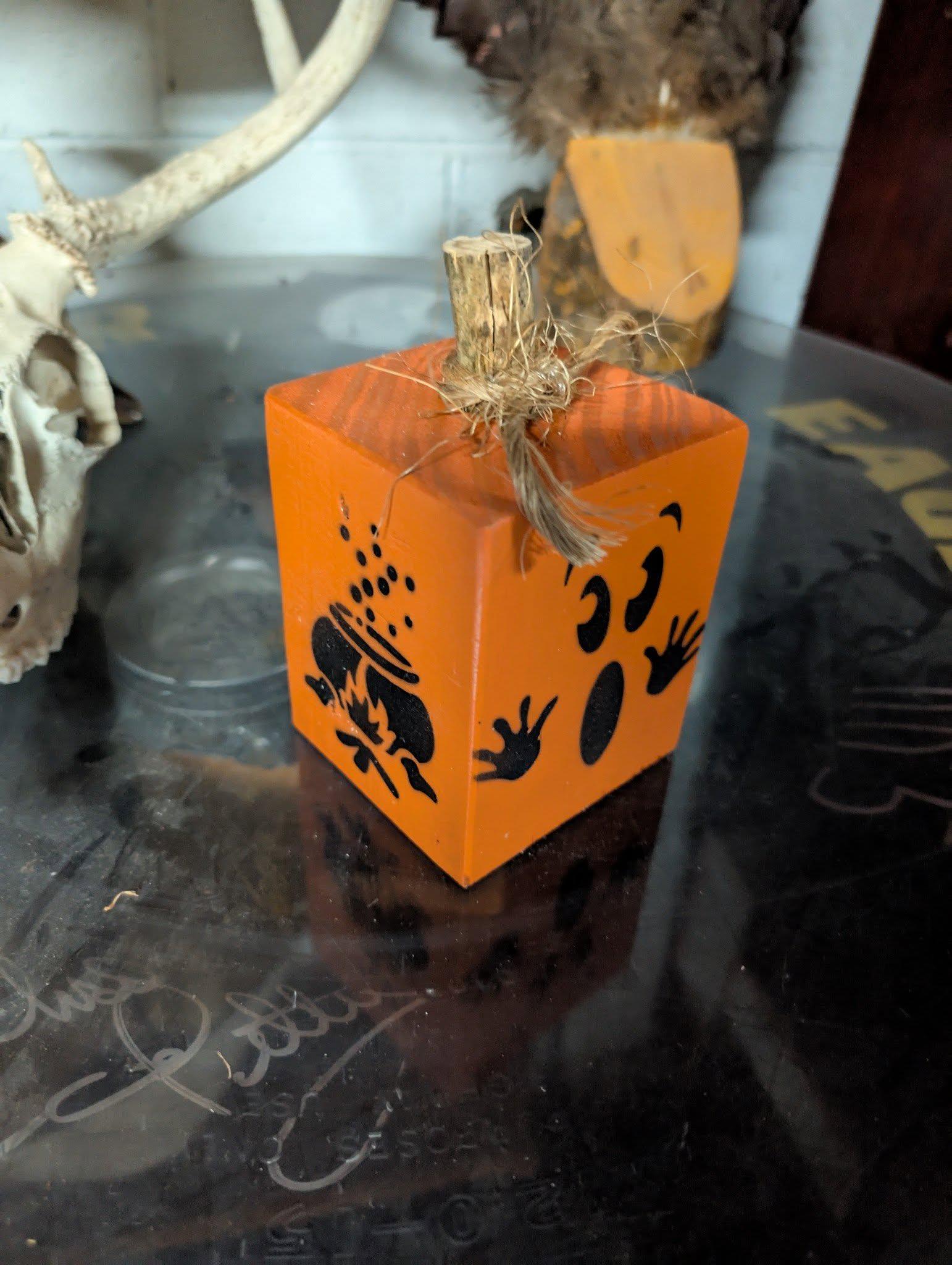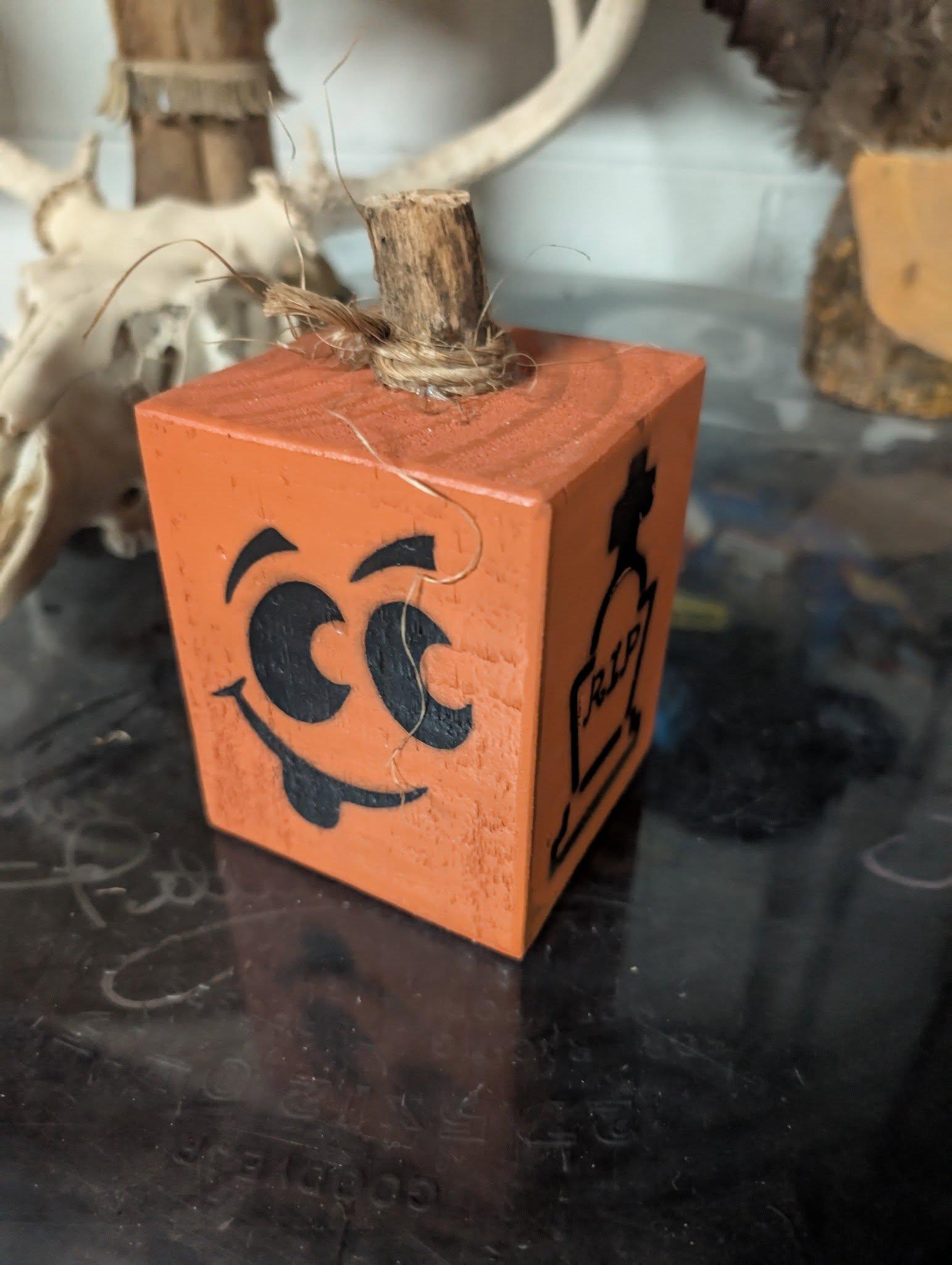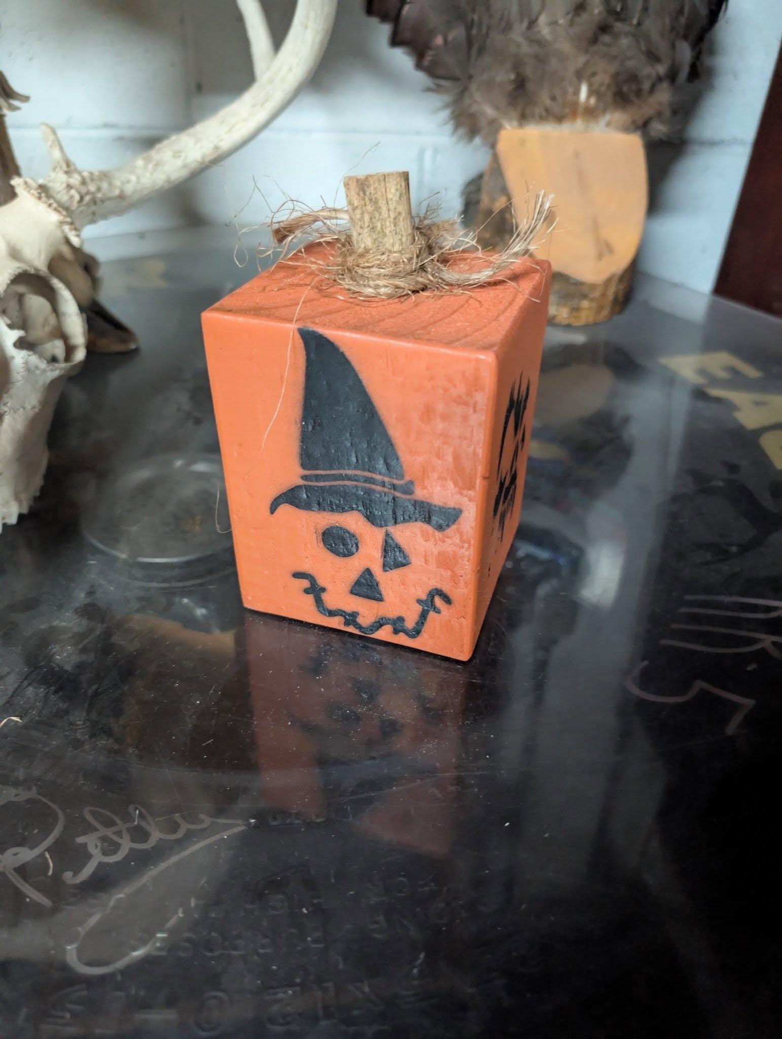 This Halloween decor item is a handmade wooden small pumpkin or jack-o-lantern, perfect for adding a seasonal touch to your home classroom or office. The orange color and about 4" squared and 5" in height make it a charming addition to any room or porch. With a free-standing mounting style and matte finish, with Halloween characters or faces on 4 sides. This unique piece hand crafted in the United States is a lightweight of approximately 1 lb, making it easy to display for the occasion. Price is for one pumpkin and includes shipping in the US.