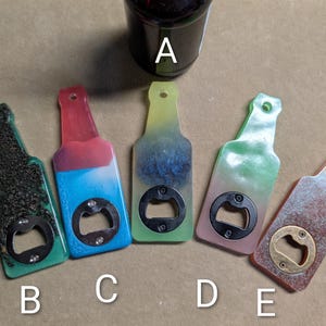 This Made in USA Bottle shaped resin bottle opener with is a unique addition to any collection. Hand crafted with care, these openers feature a variety of color scheme options regular, glow in the dark, and chameleon color schemes can add a fun pop to your breweriana collection. (A) features pink and green glow in the dark colors. (B) features a multiple color design (C) features blue water like design (D) (SOLD) features a multi color design with glow in the dark lavender, blue and green colors. This also features a magnet in the back. E) features blue and white colors (F) features a bold glow in the dark green. Made in the United States, this Bottle shaped design adds a playful touch to your barware. Adding the magnet on the back allows for convenient storage, making it both functional and stylish for any beer enthusiast. Other color options are available just let us know what you would like customizations may very price so please contact first.