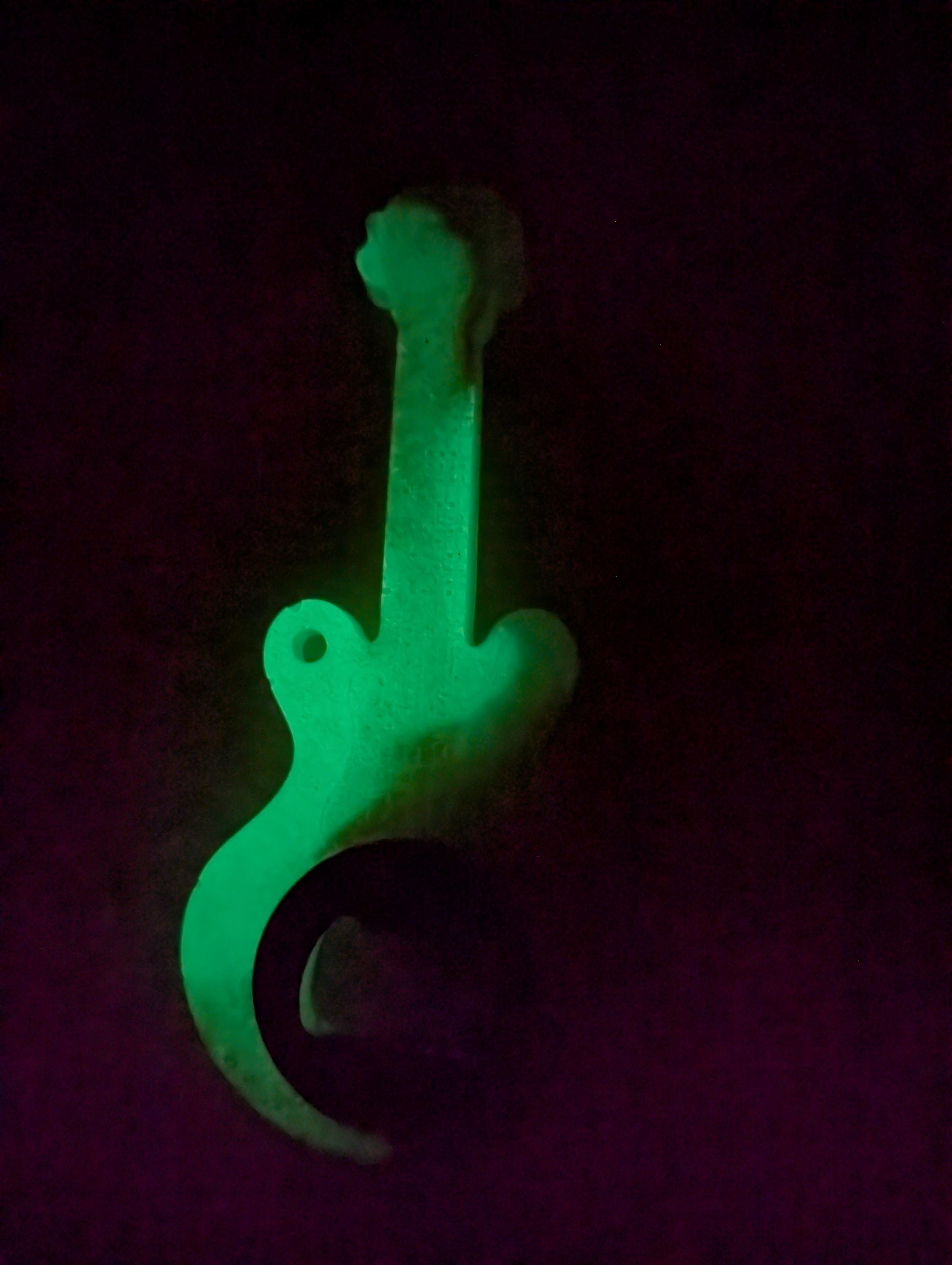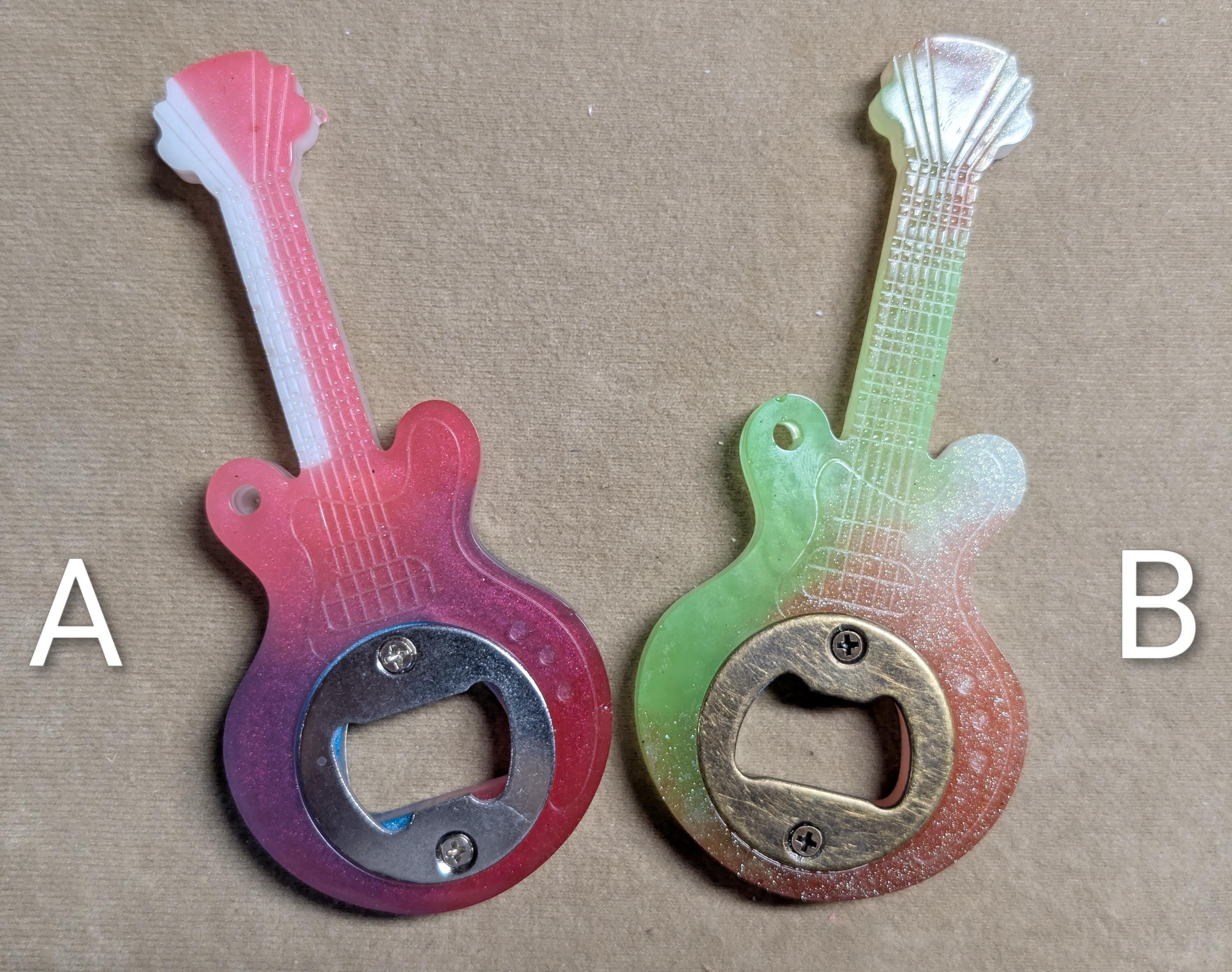 This Made in USA Guitar shaped resin bottle opener with is a unique addition to any collection. Hand crafted with care, these openers feature a variety of color scheme options regular, glow in the dark, and chameleon color schemes can add a fun pop to your breweriana collection. (A) features a multi colored design with red white and blue. (B) SOLD OUT features root beer, white, and glow in the dark green colors. Made in the United States, this guitar shaped design adds a playful touch to your barware. Adding the magnet on the back allows for convenient storage, making it both functional and stylish for any beer enthusiast. Other color options are available just let us know what you would like customizations may very price so please contact first.