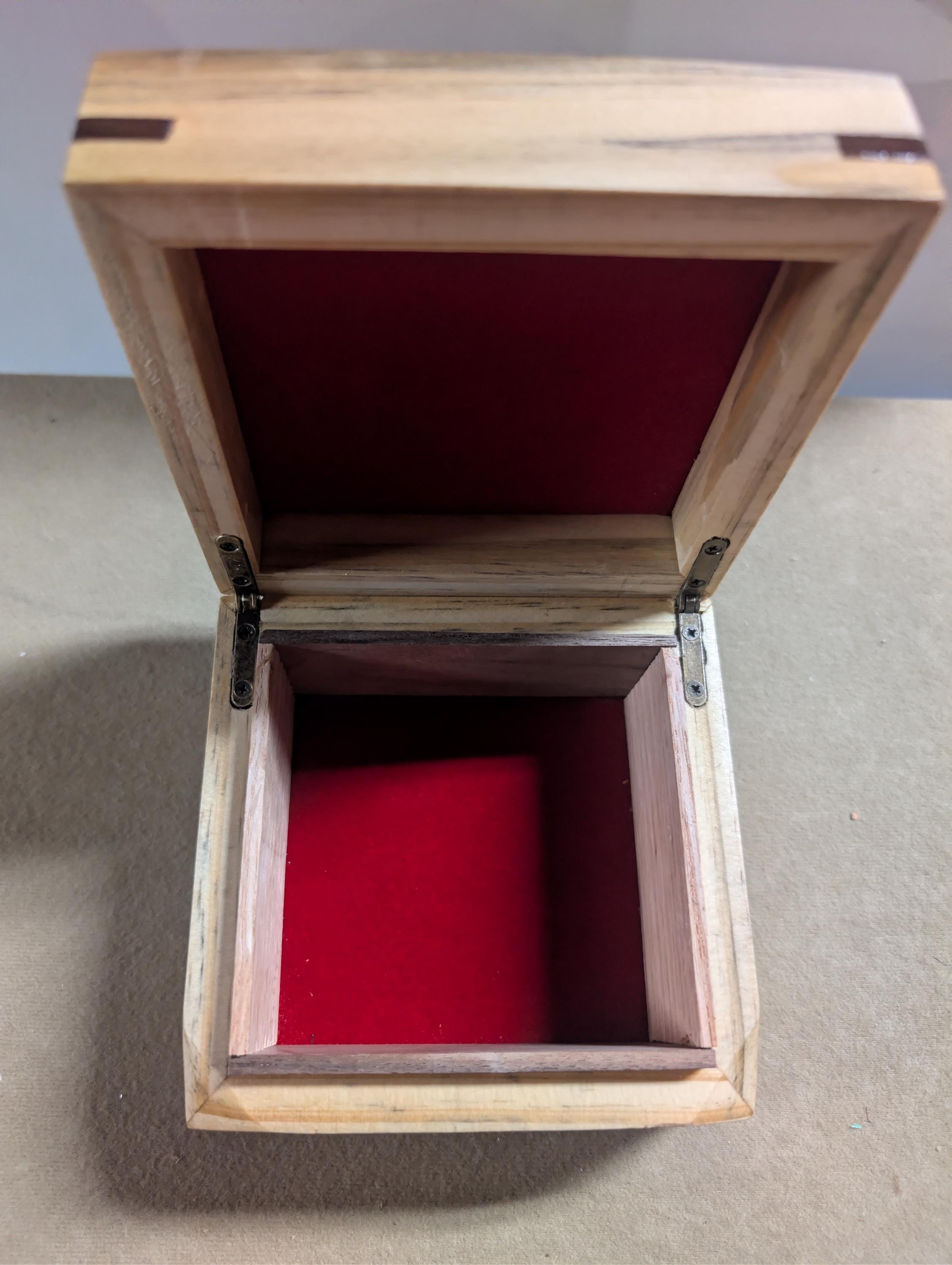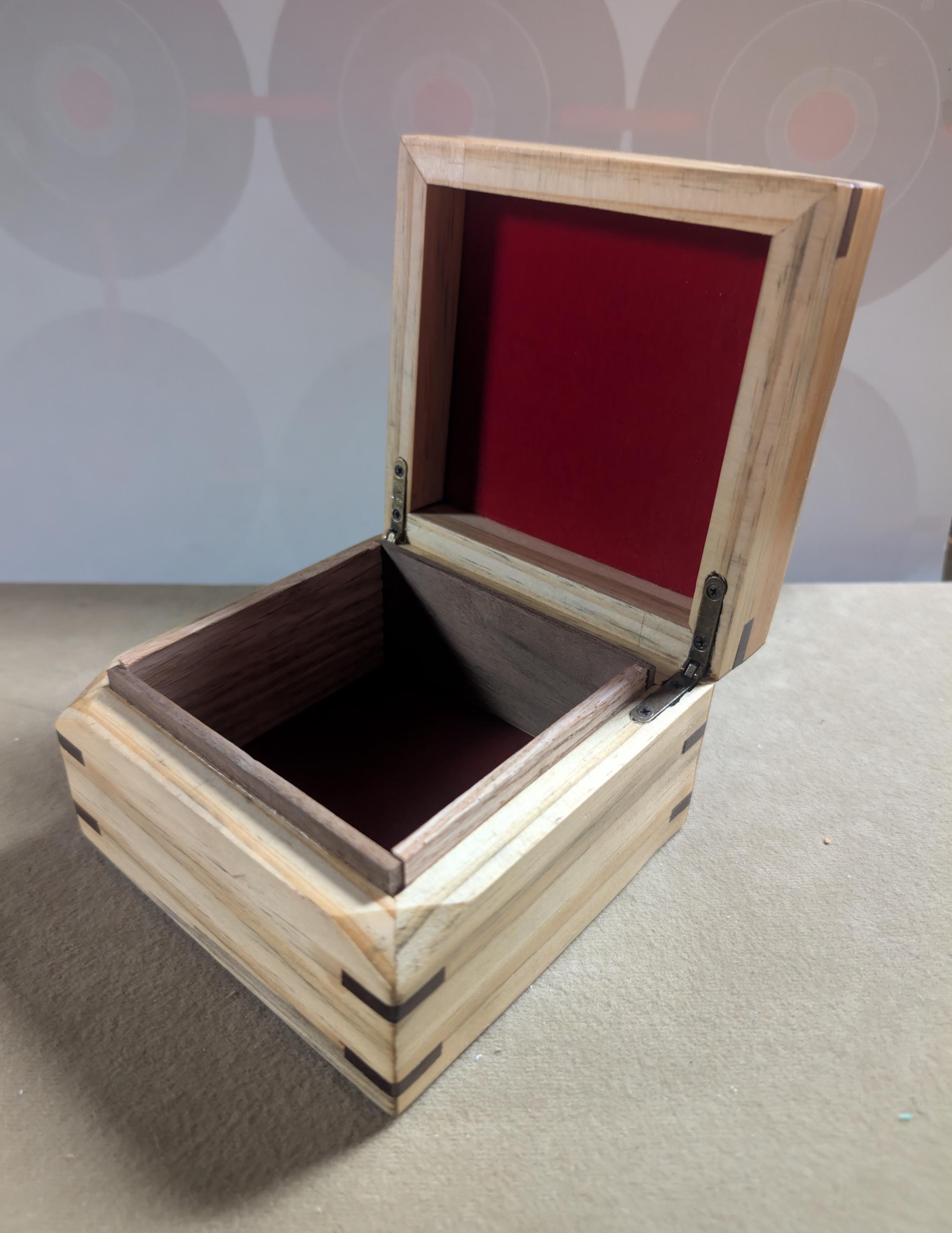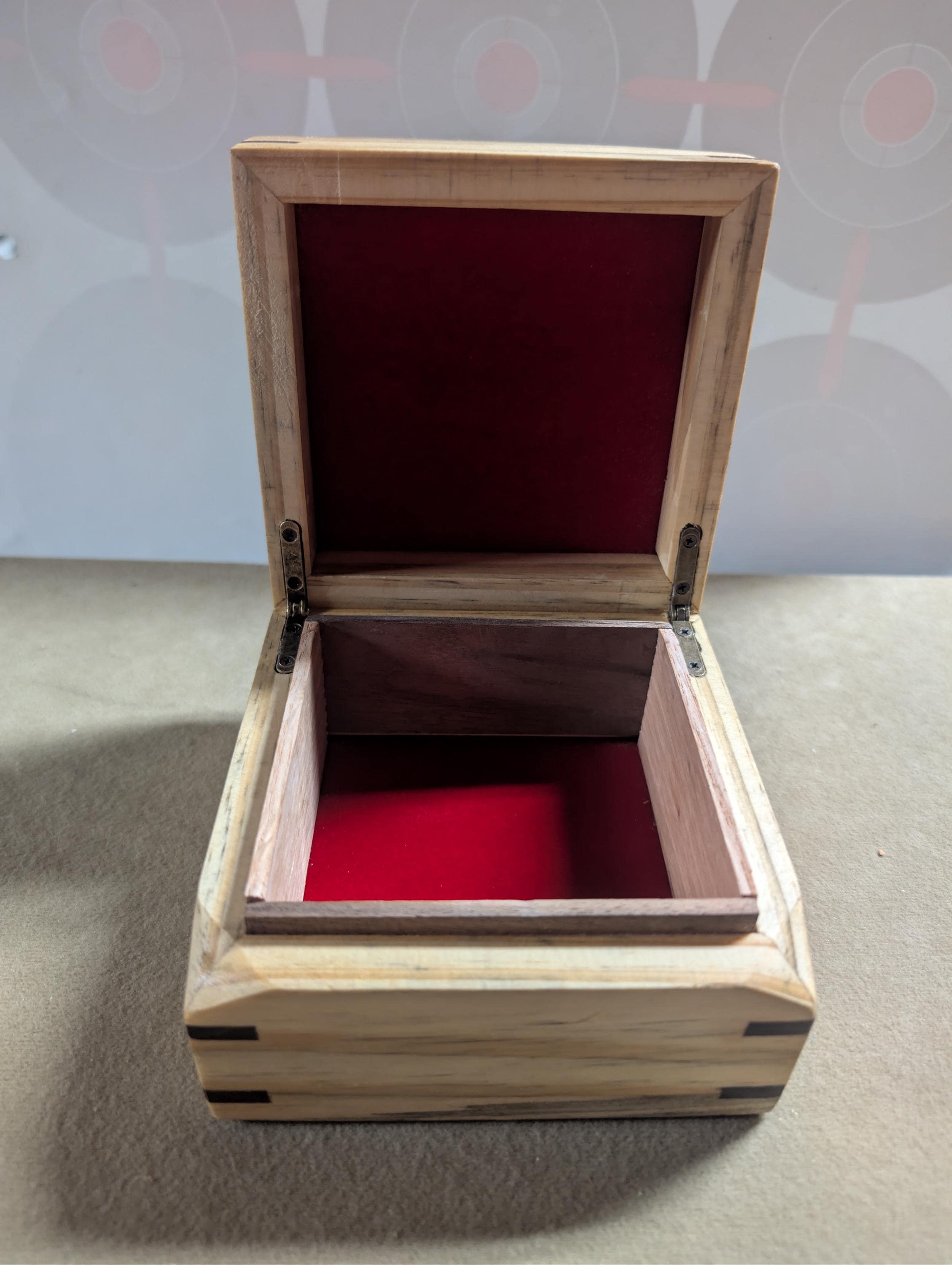 This hand-crafted Made In The USA, wooden jewelry box is made of poplar, oak, and walnut, perfect for storing necklaces, bracelets, anklets, rings, cufflinks, earrings, or any other keepsakes. The square-shaped box features a natural wood color and red velvet lining, adding a touch of elegance. With dimensions of 5 inches in length and depth, and 3 inches in depth, it offers ample space for organizing and displaying your cherished accessories. The rustic/primitive theme and handcrafted design make this jewelry box a unique addition to any home decor. Special orders can be made by email. We offer this size in a variety of hard woods and exotics. Please allow a 3 day grace period on shipping for custom orders. Shipping is free for all orders in the U.S. Personalization is available and will be added to top of box if requested. If another location on box is desired please message with request before purchasing.