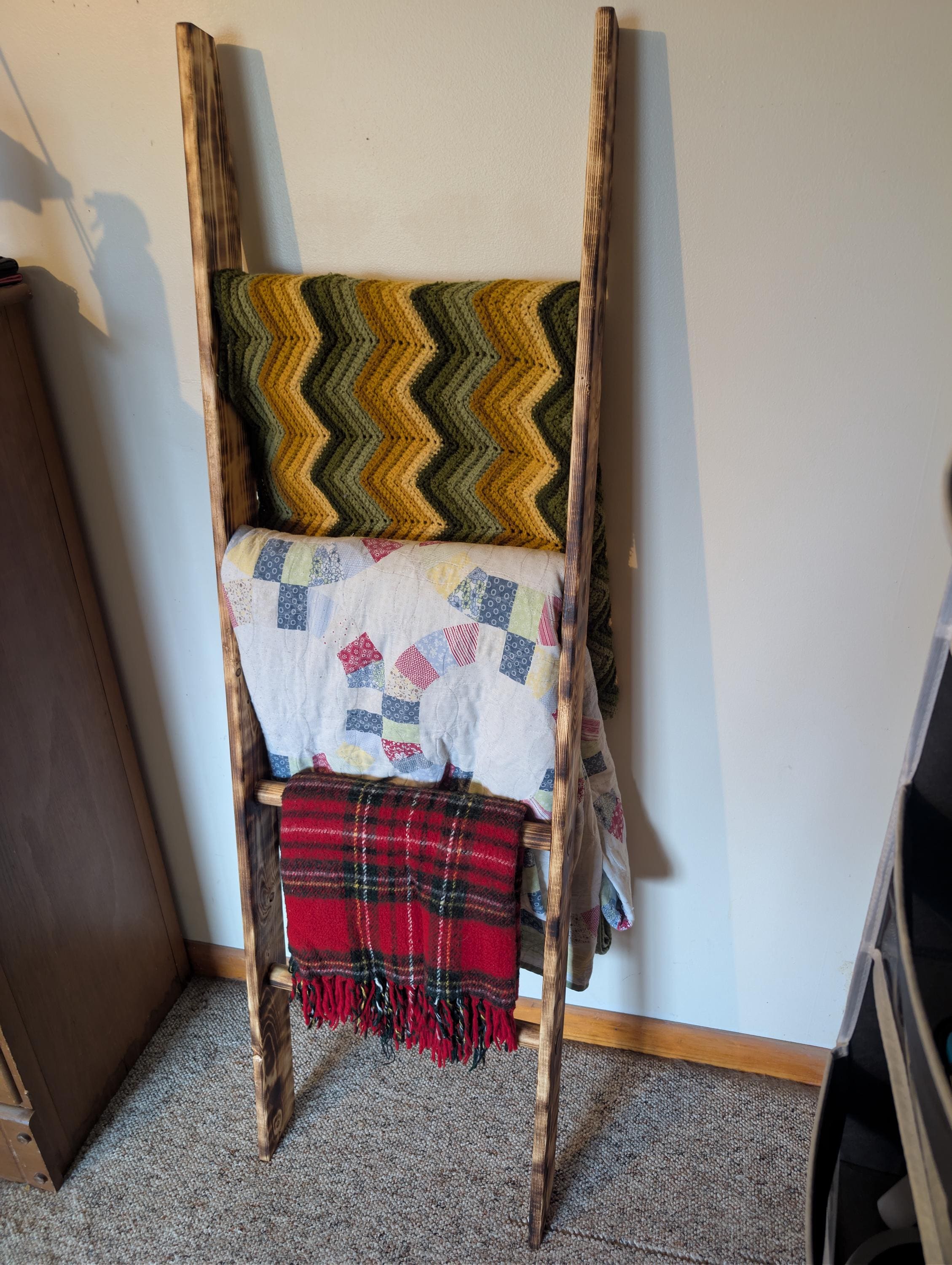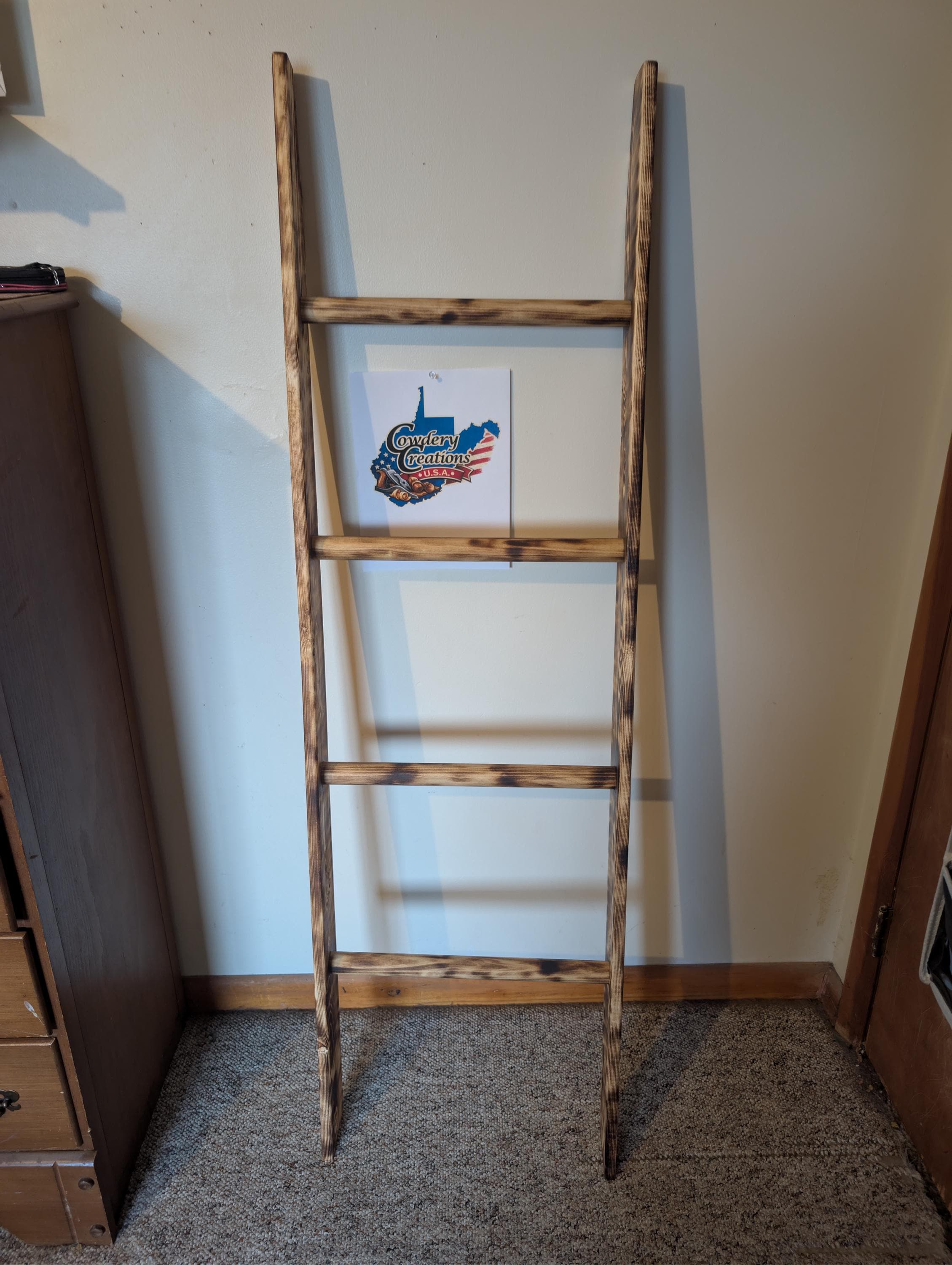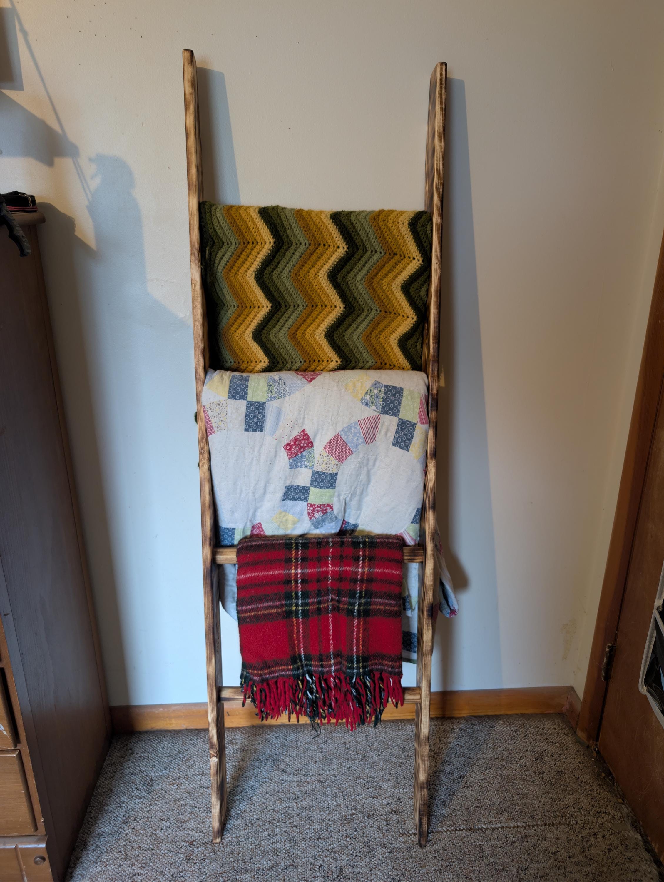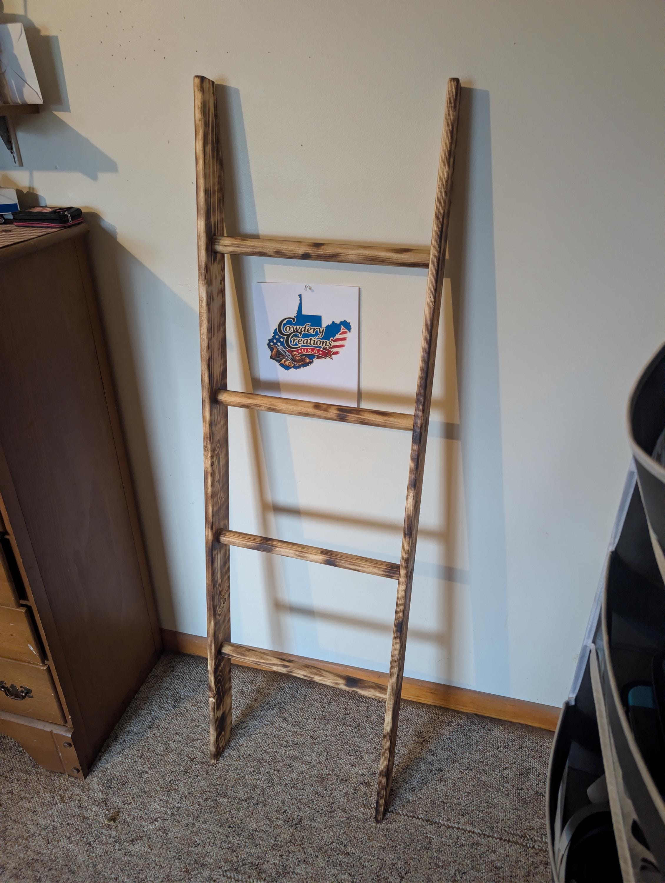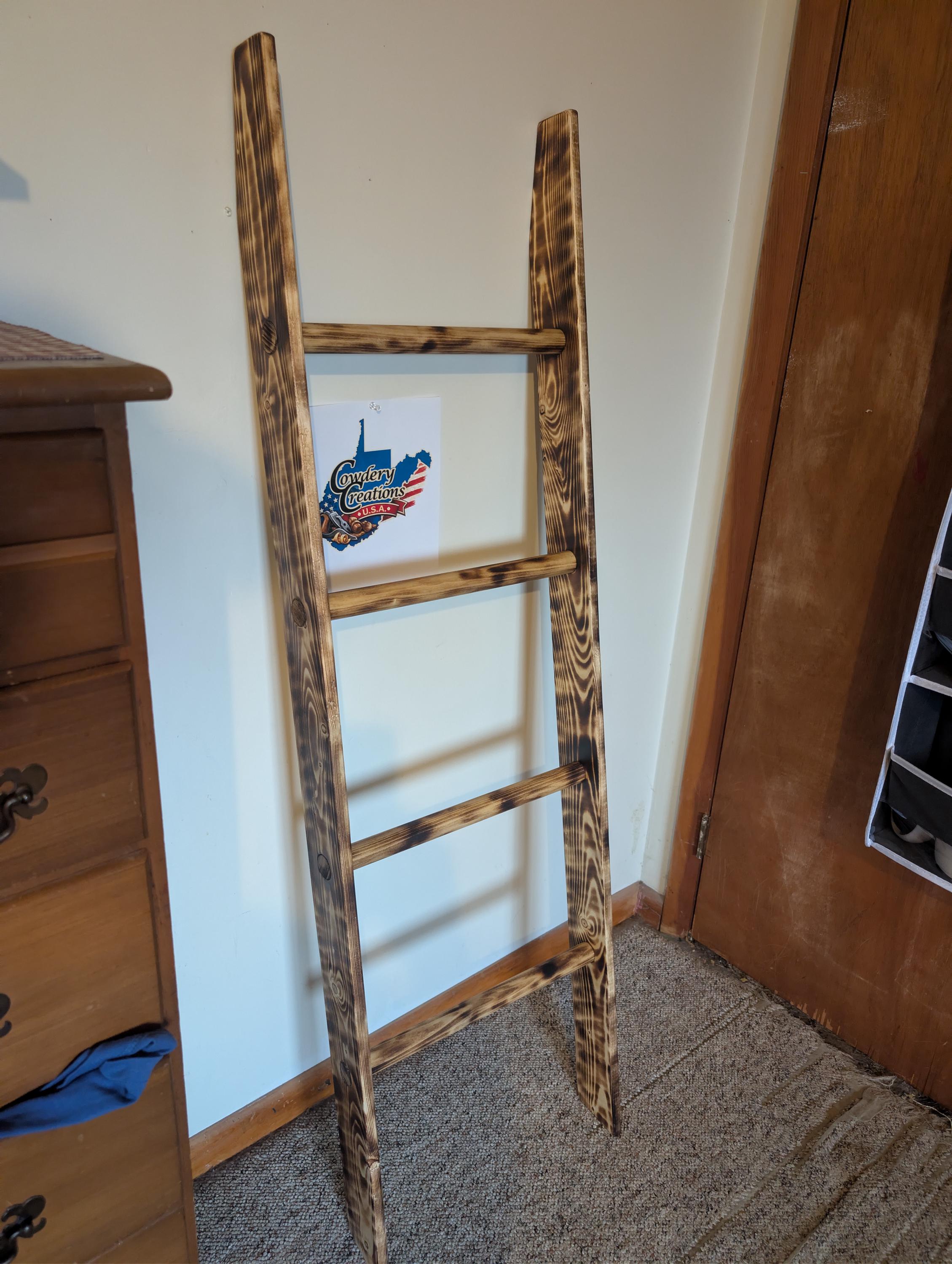 Fresh out of the shop. Hand crafted wooden ladder for Quilt / Afghan holder or towel rack. Has four runs and is slanted at bottom and top to lean against the wall. Made from pine with a shou sugi ban and natural finish. For decor only, not made for climbing. About 58" tall and 17" wide with a 3 5" thickness. Priced at $$100.00 Shipped. That's right shipping is free. Want a different size or stain / finish? Custom orders are available.