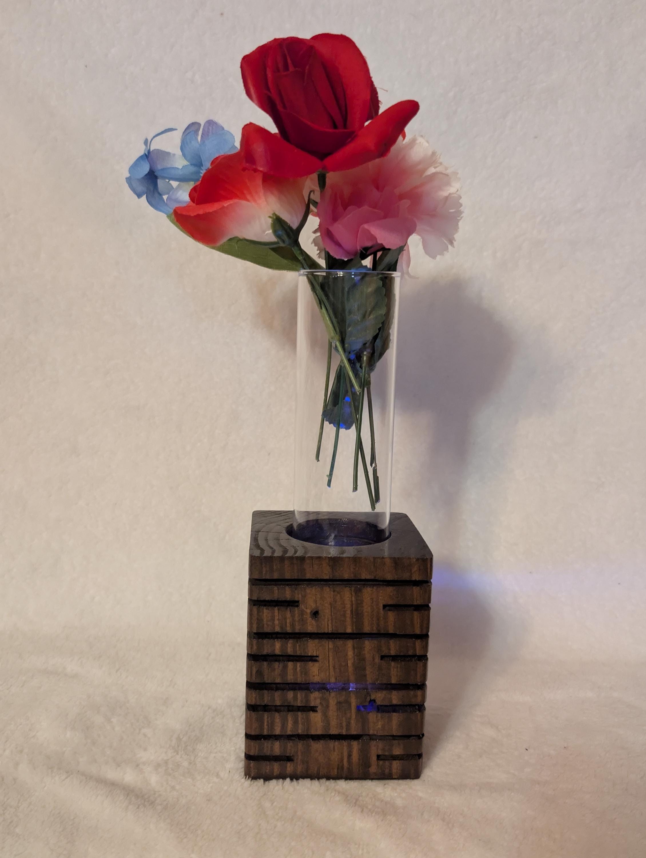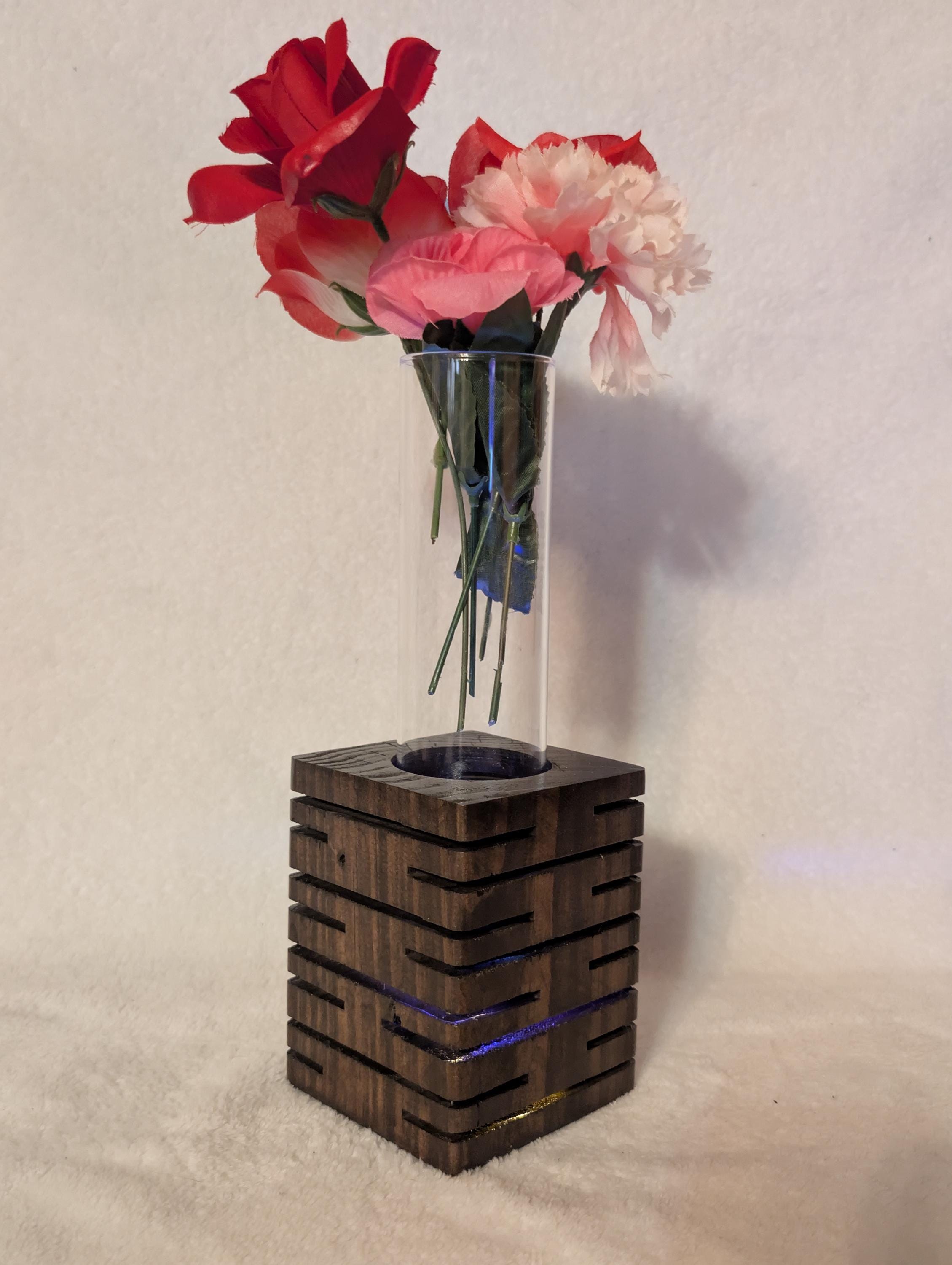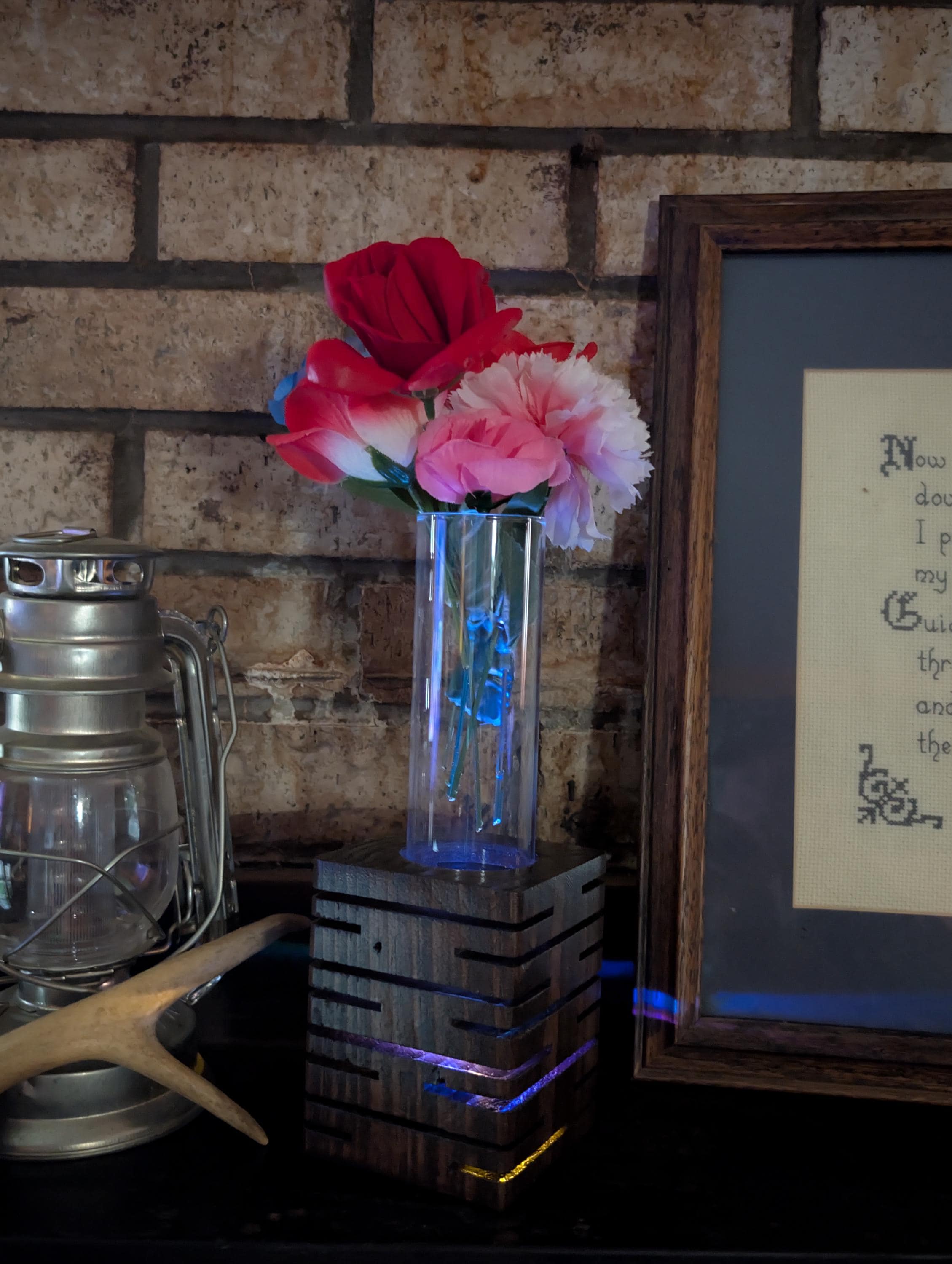 Rustic modern handcrafted flower vase/propagation tube and stand stained with kona. With colored lighting. Handcrafted here in the USA by our hands to your home. This flower vase/propagation tube with base that measures 4.5" x3.5" x 3.5". This beauty is made of pine and is lit with colored fairy lights with 3 modes, flashing, slow flash, and solid. Other stains are available. Priced at $25.00 shipped. That's right Shipping is free in the US
