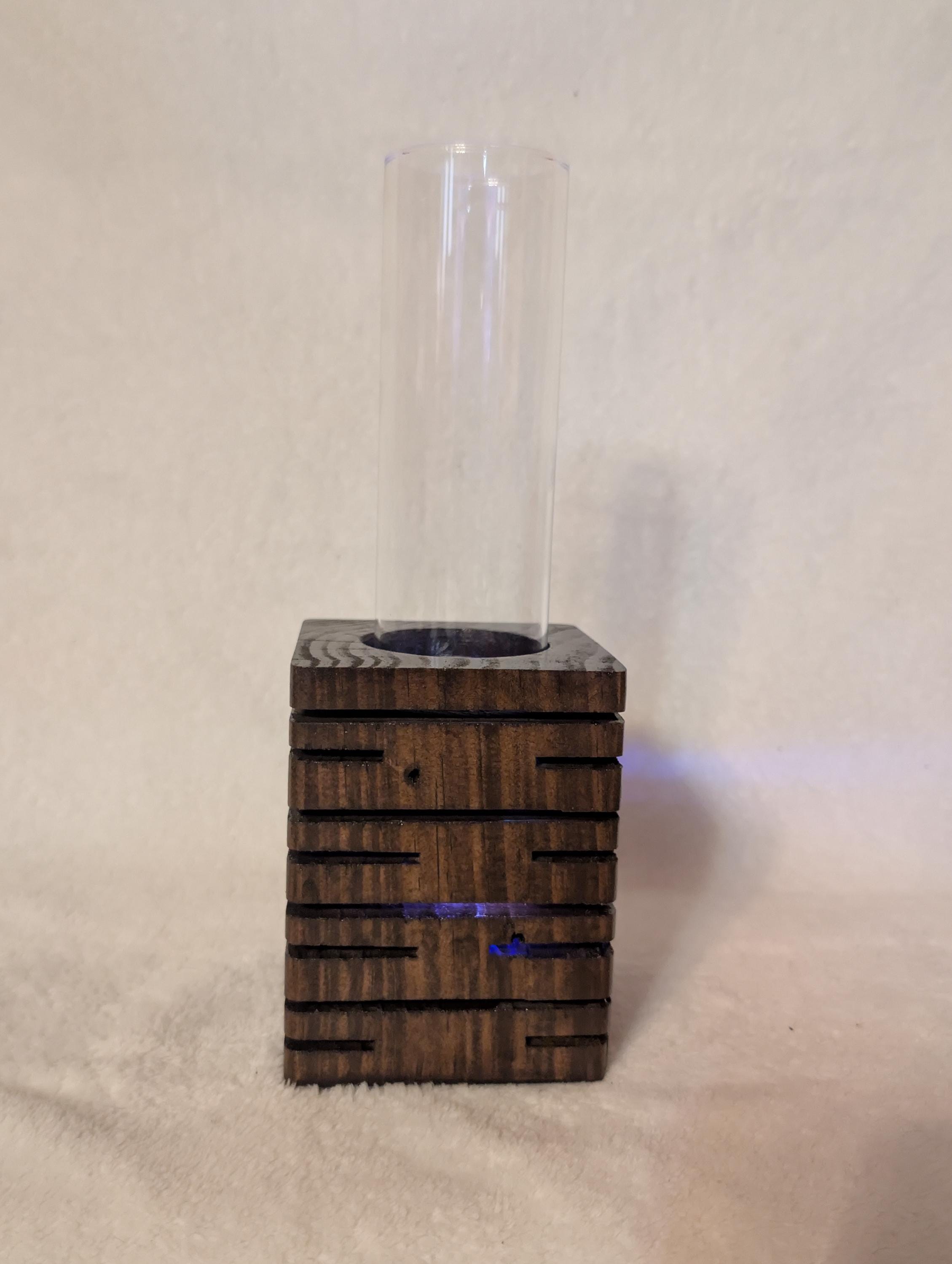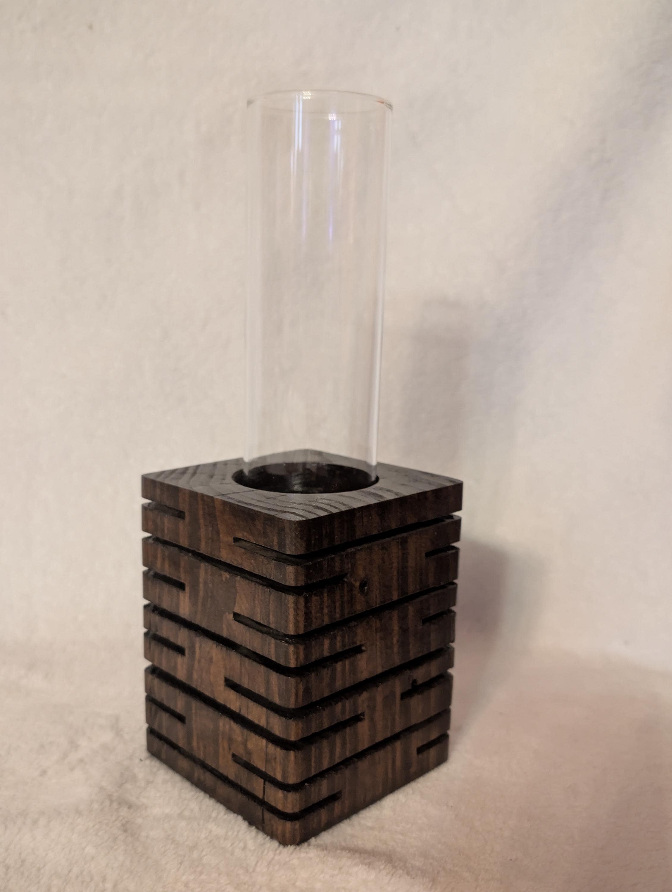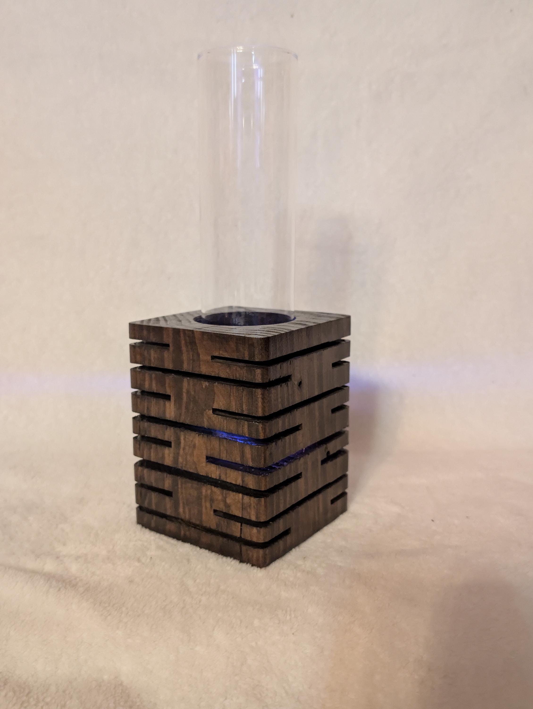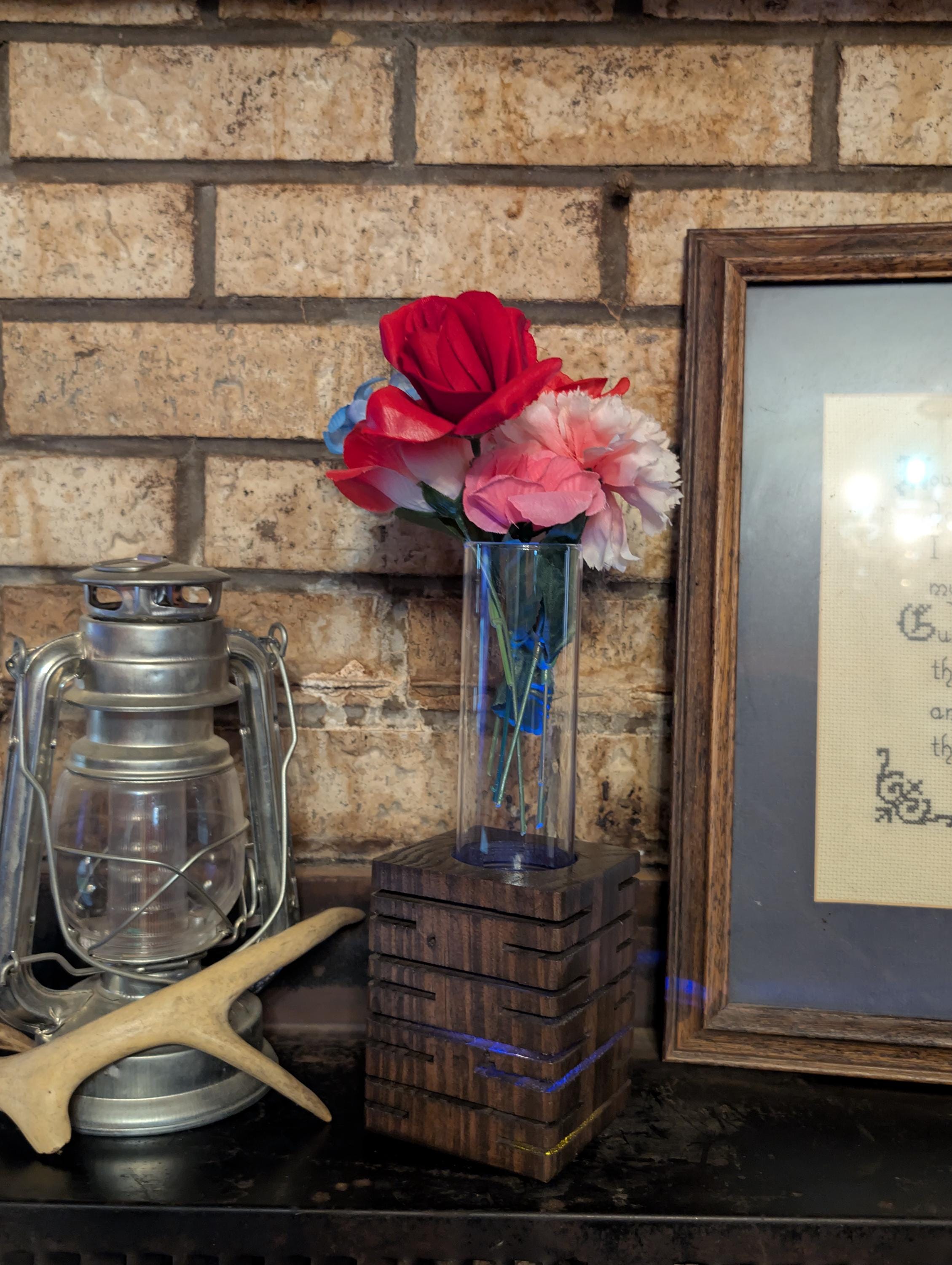 Rustic modern handcrafted flower vase/propagation tube and stand stained with kona. With colored lighting. Handcrafted here in the USA by our hands to your home. This flower vase/propagation tube with base that measures 4.5" x3.5" x 3.5". This beauty is made of pine and is lit with colored fairy lights with 3 modes, flashing, slow flash, and solid. Other stains are available. Priced at $25.00 shipped. That's right Shipping is free in the US
