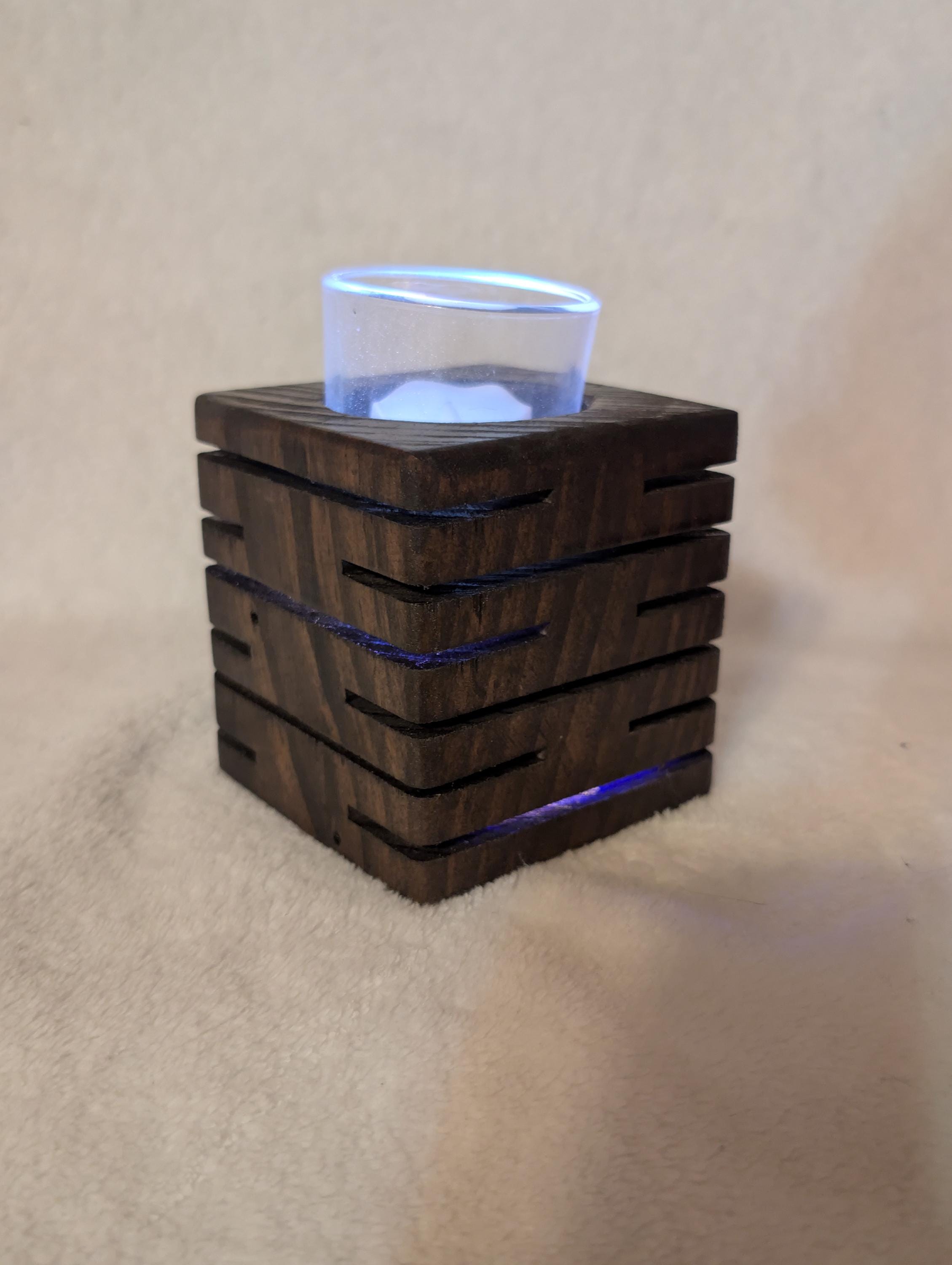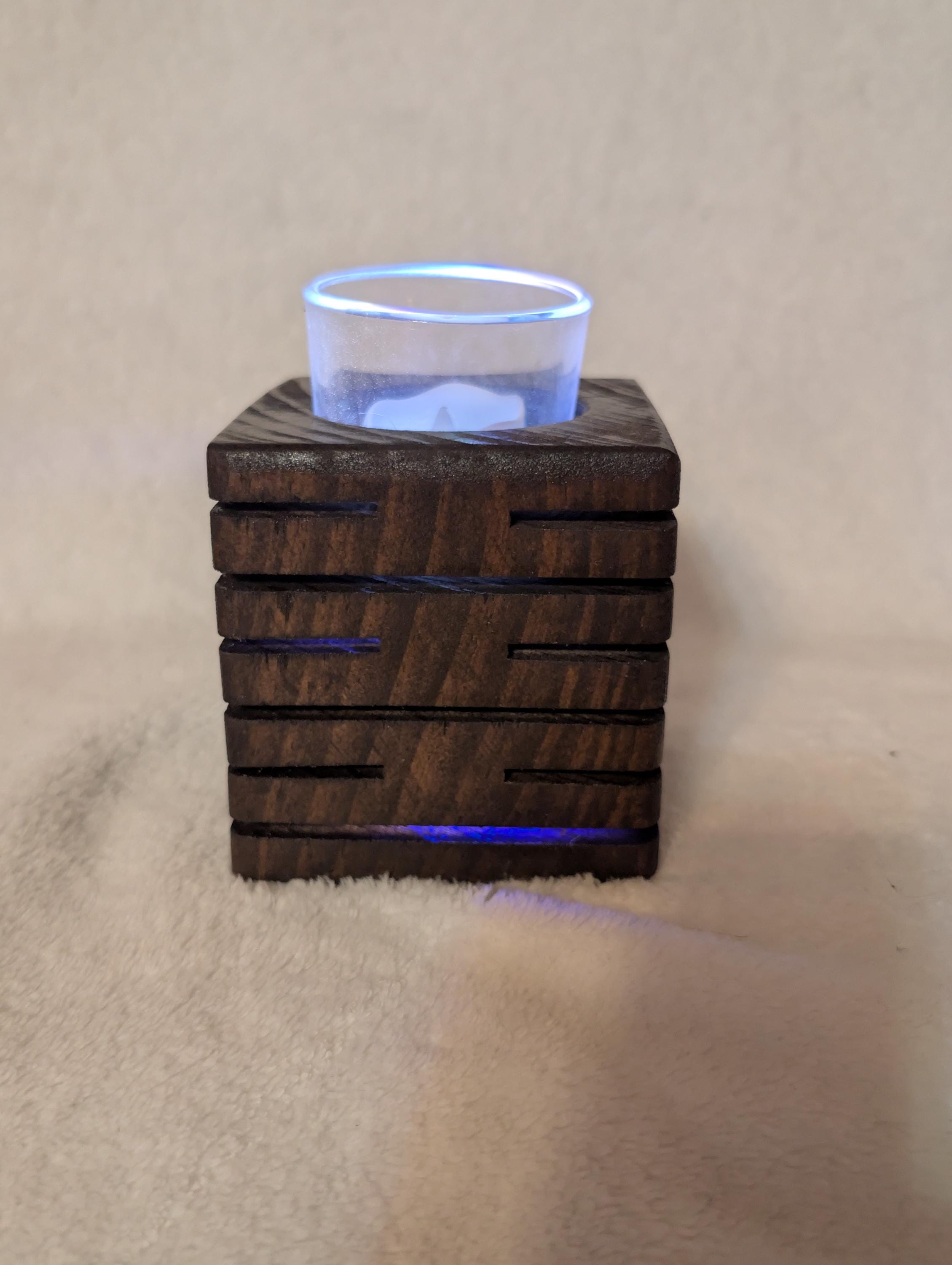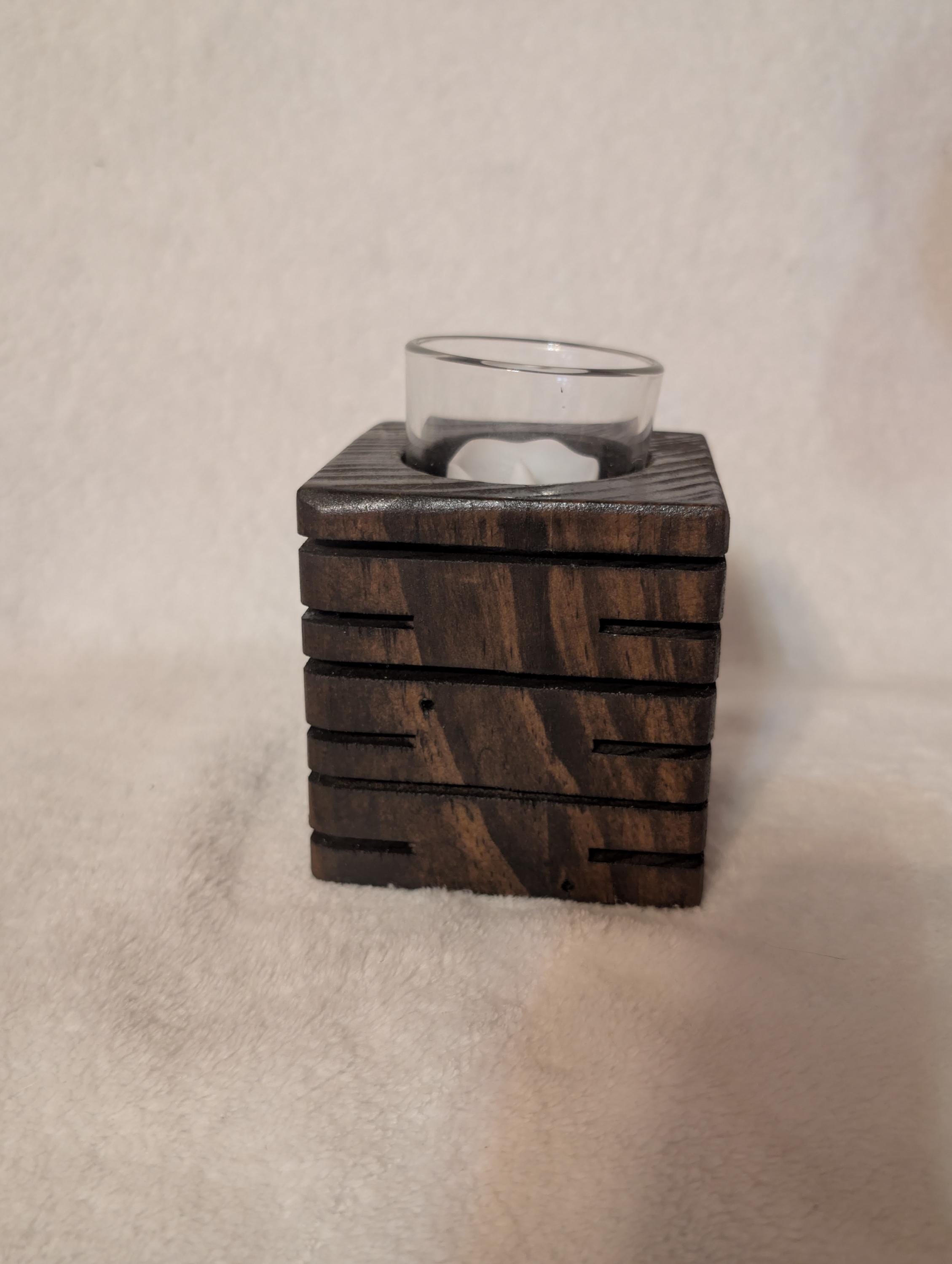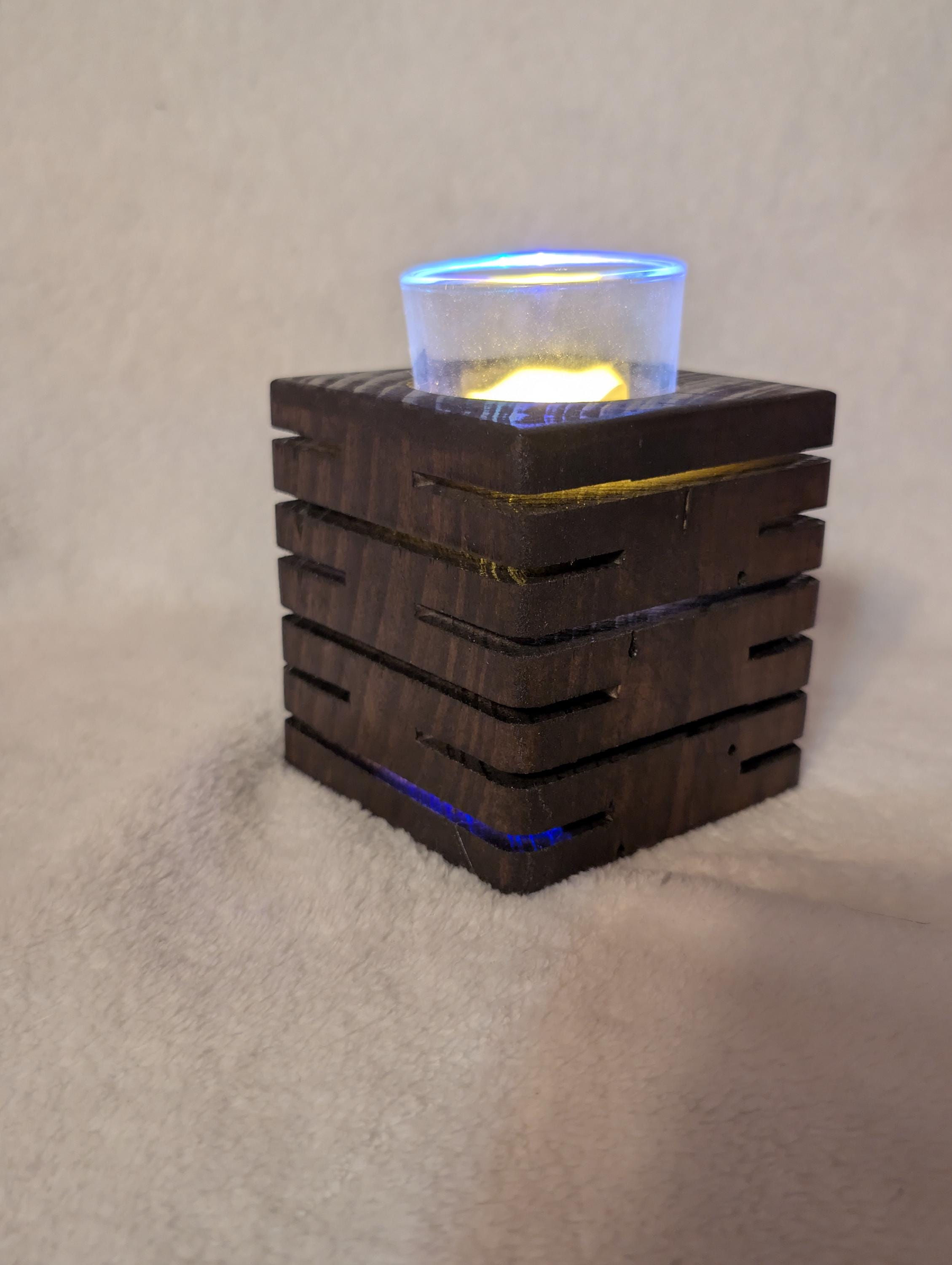 Rustic modern handcrafted candle holder stained with kona. With colored lighting. Handcrafted here in the USA by our hands to your home. This candle holder measuring 3.5" x 3.5" x 3.5" with a glass candle votive, battery operated candle and wax candle. This beautiful candle holder is made of pine and are lit with colored fairy lights with 3 modes, flashing, slow flash, and solid. Other stains are available. Priced at $25.00 shipped. That's right Shipping is free in the US.
