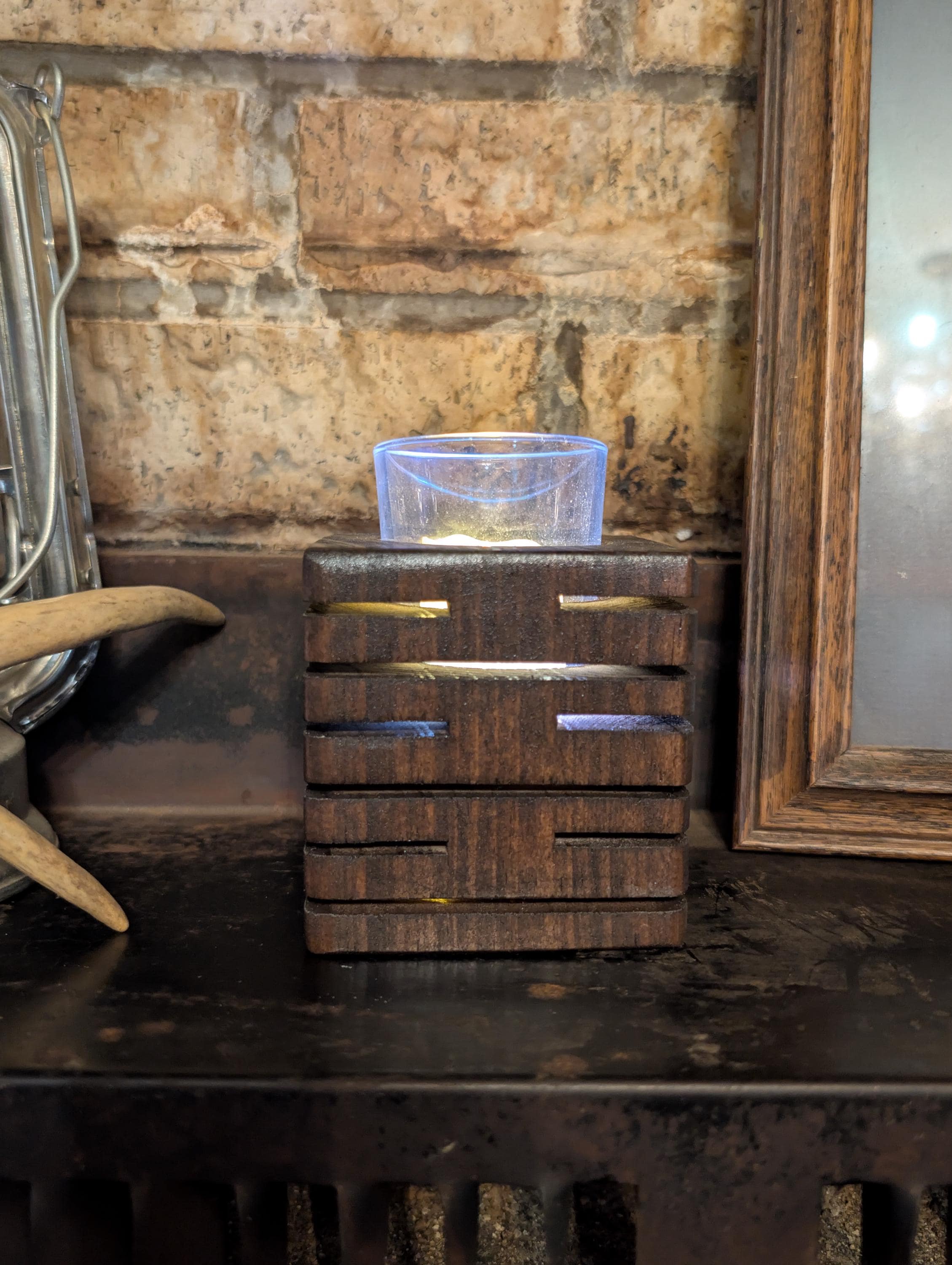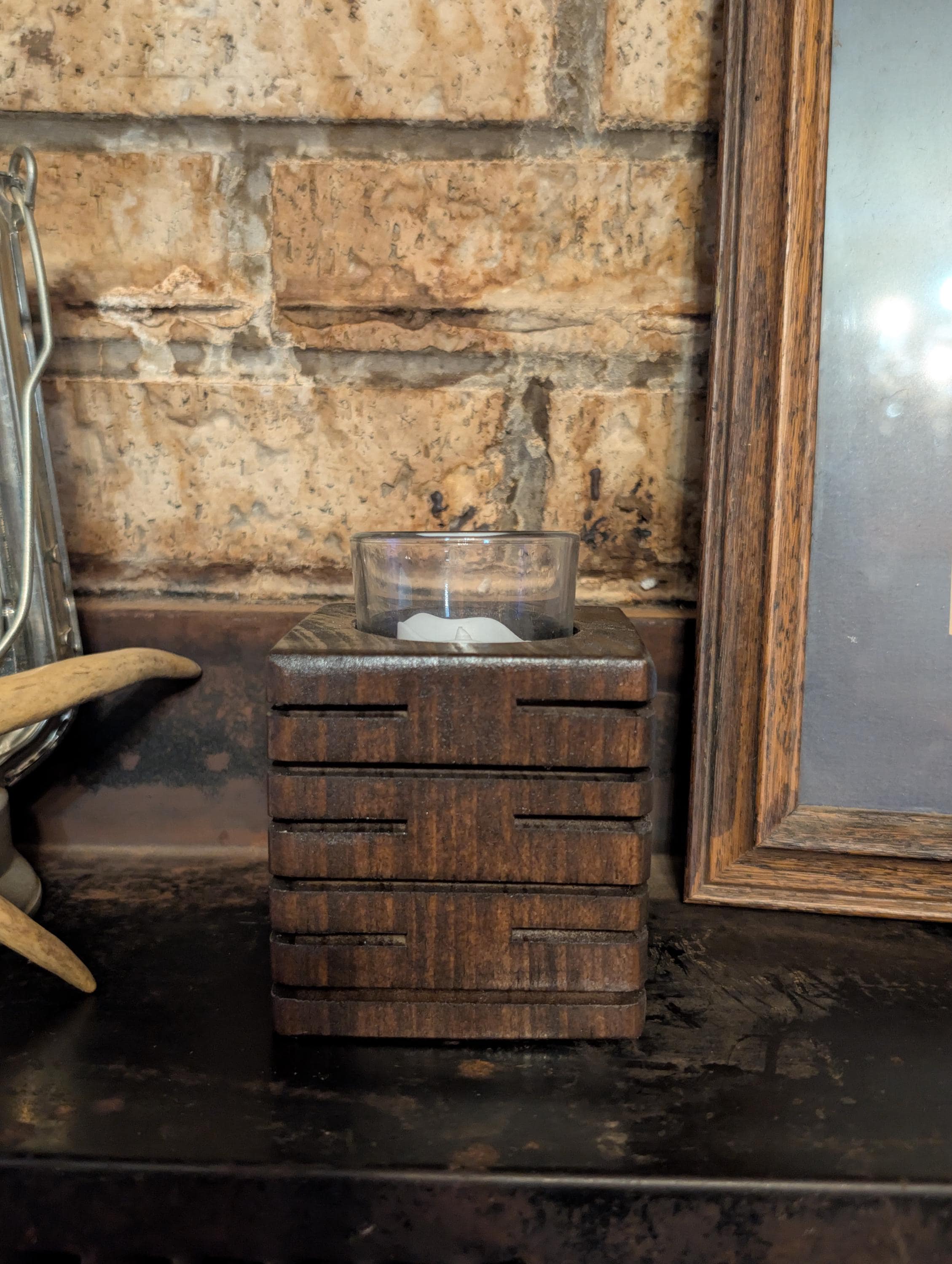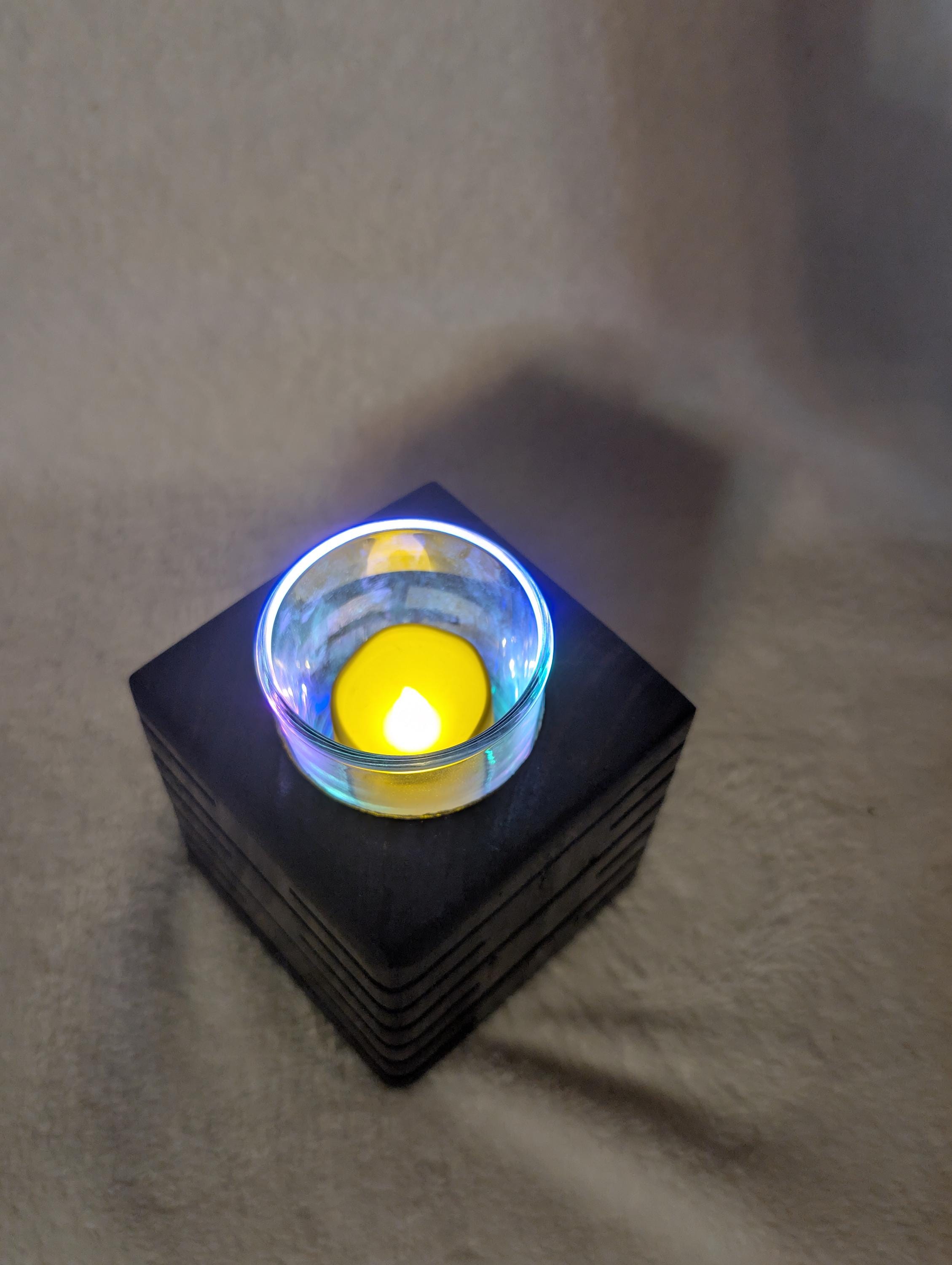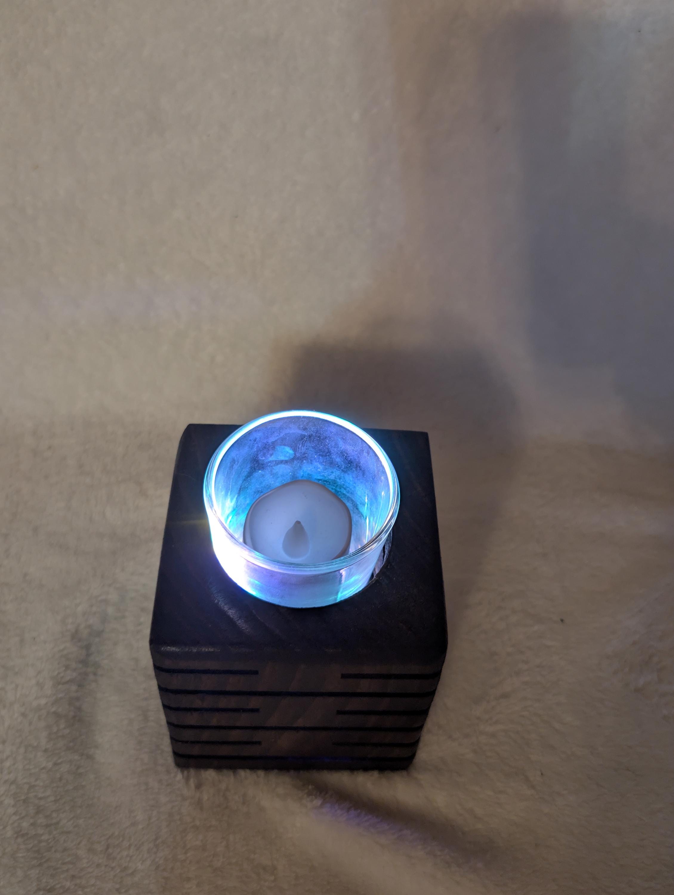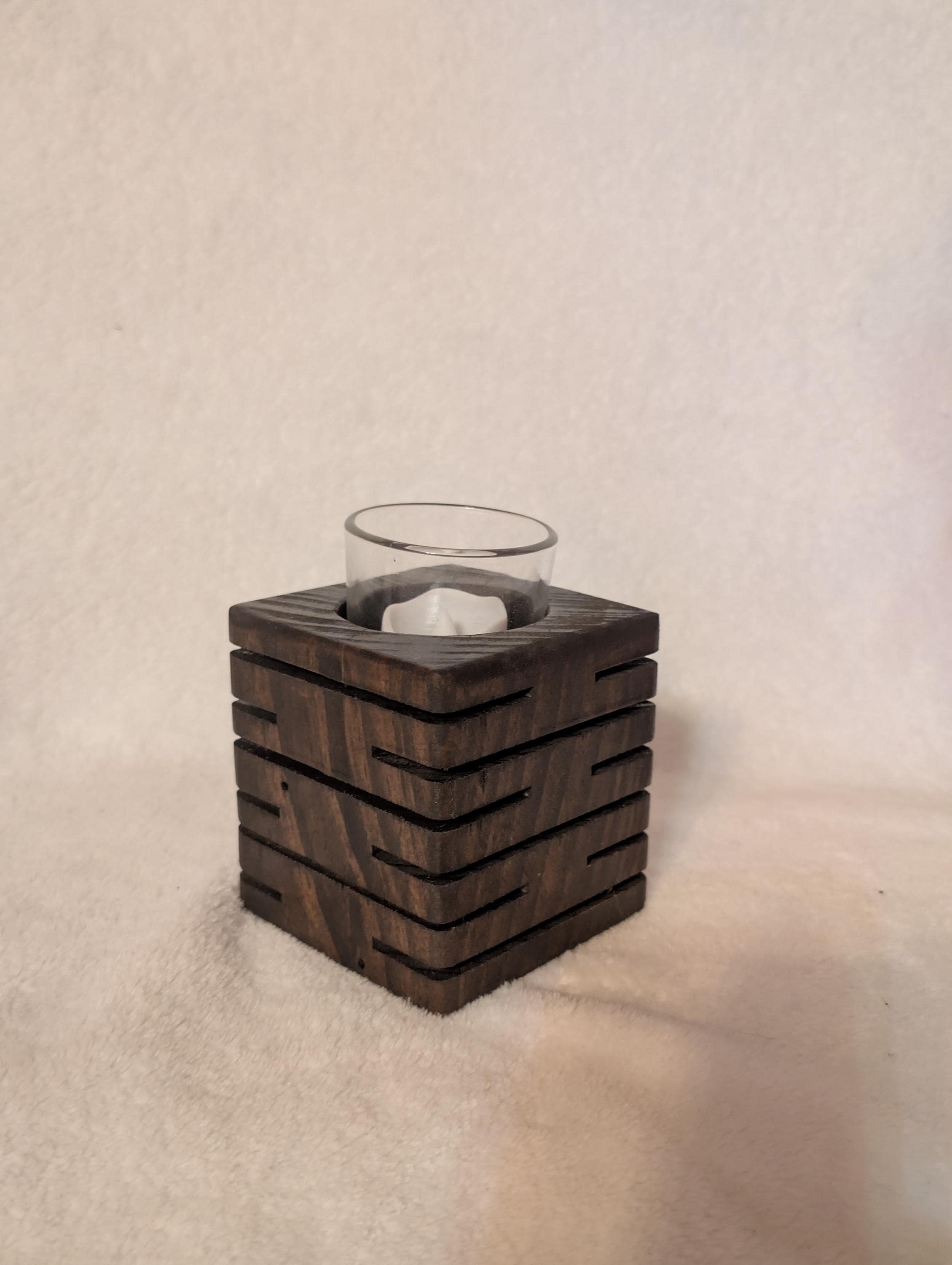 Rustic modern handcrafted candle holder stained with kona. With colored lighting. Handcrafted here in the USA by our hands to your home. This candle holder measuring 3.5" x 3.5" x 3.5" with a glass candle votive, battery operated candle and wax candle. This beautiful candle holder is made of pine and are lit with colored fairy lights with 3 modes, flashing, slow flash, and solid. Other stains are available. Priced at $25.00 shipped. That's right Shipping is free in the US.